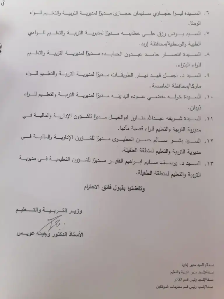 قرر وزير التربية والتعليم والتعليم العالي والبحث العلمي الدكتور وجيه عويس، اليوم الخميس إجراء عدد من التنقلات على مستوى المدراء في الوزارة والميدان، وذلك بناء على تنسيب الأمين العام للشؤون الإدارية والمالية.