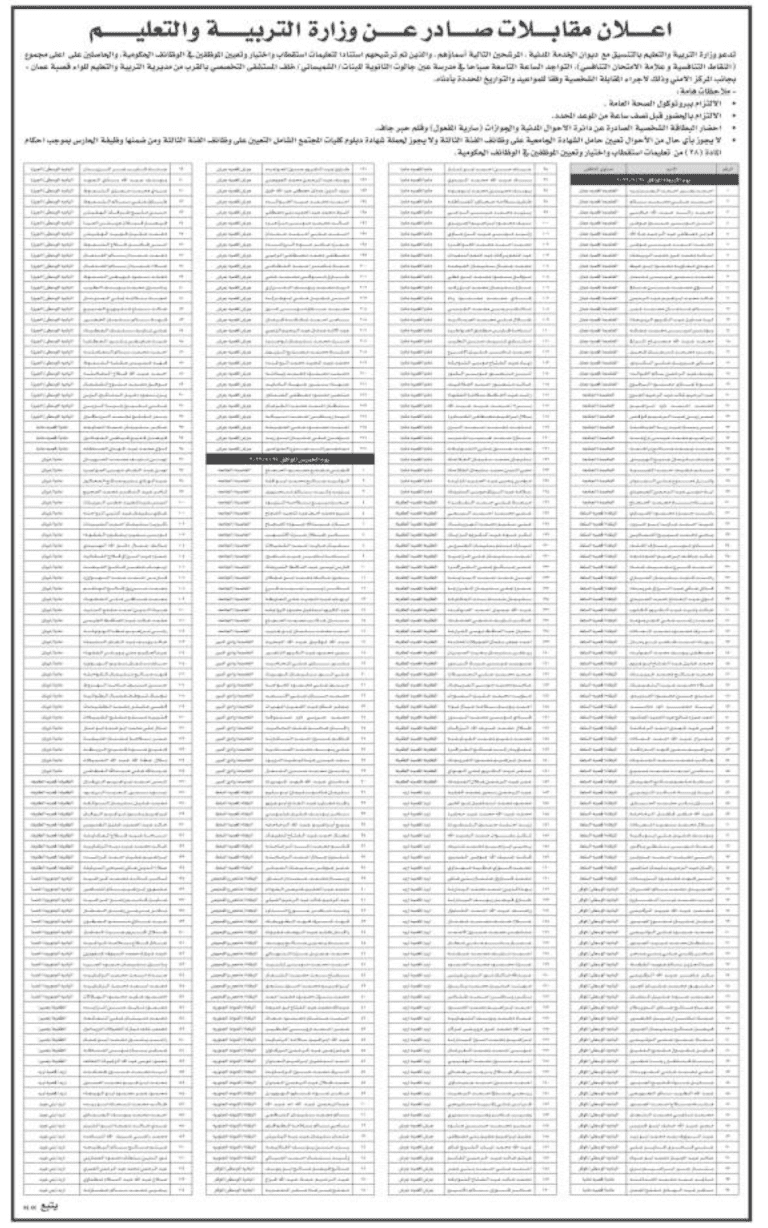 دعت وزارة التربية والتعليم بالتنسيق مع ديوان الخدمة المدنية؛ المرشحين التالية أسماؤهم والذين تم ترشيحهم استنادا لتعليمات استقطاب واختيار تعيين الموظفين في الوظائف الحكومية؛ والحاصلين على اعلى مجموع (النقاط التنافسية وعلامة الامتحان التنافسي)، التواجد الساعة التاسعة صباحا في مدرسة عين جالوت الثانوية للبنات / الشميساني / خلف المستشفى التخصصي بالقرب من مديرية التربية والتعليم للواء قصبة عمان – بجانب المركز الامني وذلك لاجراء المقابلة الشخصية وفقا للمواعيد والتواريخ المحددة بأدناه.