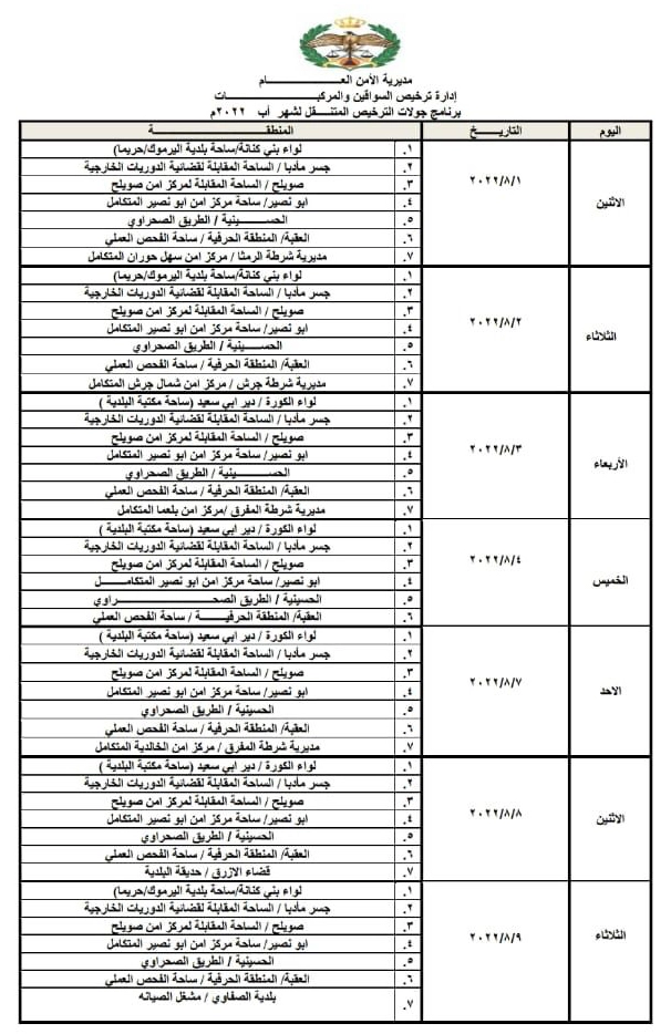 أعلنت إدارة ترخيص السواقين والمركبات عن مواعيد العمل بجولات الترخيص المتنقل ضمن المبادرة الابتكارية ( بنوصلك ) خلال شهر اب لعام 2022م في عدد من مناطق المملكة.