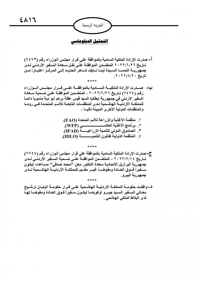 كما صدرت الإرادة الملكية السامية بالموافقة على قرار مجلس الوزراء المتضمن الموافقة على تسمية السفير الأردني في جمهورية إيطاليا قيس عقلة برهم أبو دية مندوبا للمملكة الأردنية للمنظمات التابعة للأمم المتحدة في روما والمنظمات الدولية الأخرى المبينة تاليًا: منظمة الأغذية والزراعة للأمم المتحدة وبرنامج الأغذية العالمي، والصندوق الدولي للتنمية الزراعية، والمنظمة الدولية لقانون التنمية.
