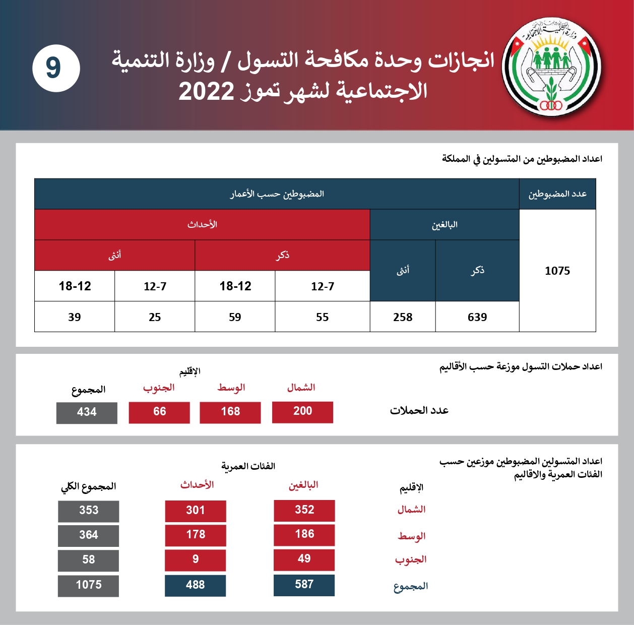 من جانب آخر، أشارت الوزارة إلى أن كوادر مديرية مكافحة التسول ضبطت 1075 متسولا، وأجرت 434 حملة، و 530 دراسة متعلقة بحالات الأحداث، حيث دخل إليها 307 أحداث خلال تموز الماضي، وأجرت 1487 دراسة لطلب الحصول على إعفاء من رسوم تصريح العمل.