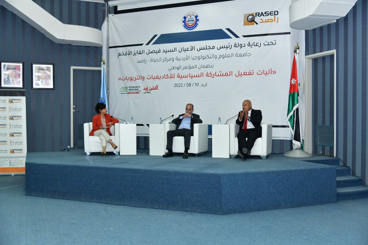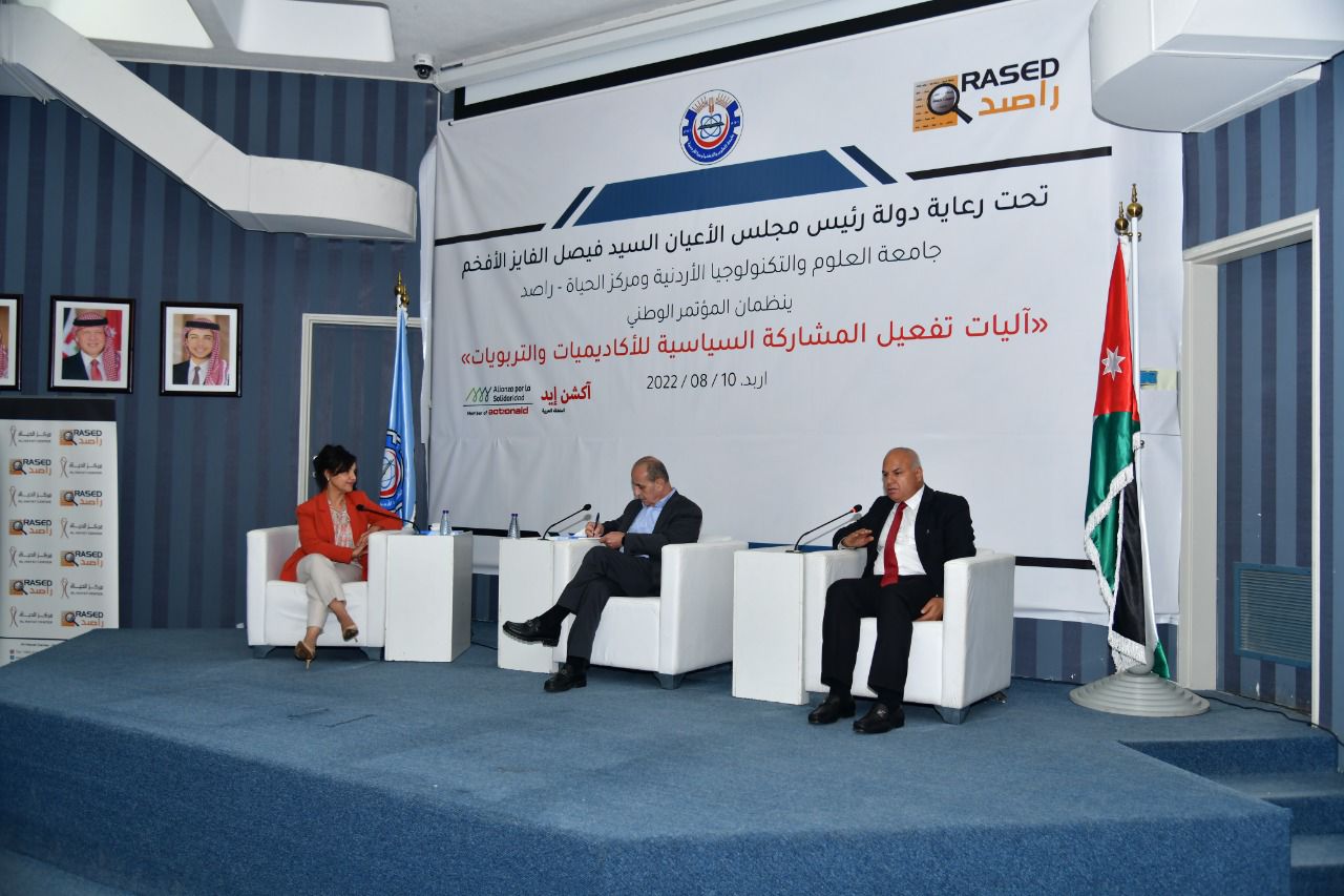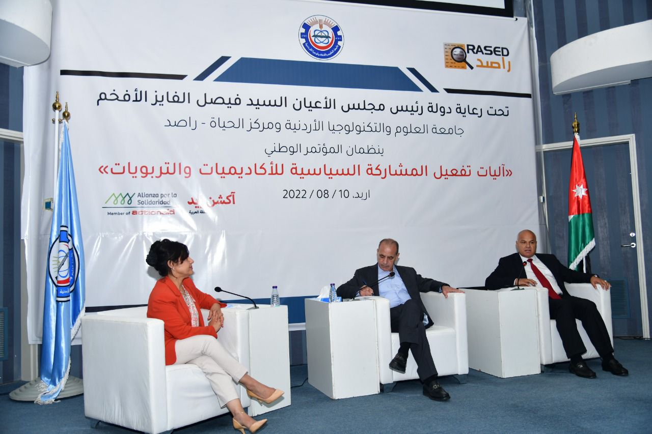 ضمن فعاليات المؤتمر الوطني "اليات تفعيل المشاركة السياسية للأكاديميات والتربويات" والذي عقد تحت رعاية دولة رئيس مجلس الأعيان السيد فيصل الفايز، وذلك بتنظيم من جامعة العلوم والتكنولوجيا ومركز الحياة – راصد، عقدت جلسة حوارية تحت عنوان " دور عملية التحديث السياسي في تفعيل المشاركة السياسية للأكاديميات والتربويات"، وشارك بالجلسة معالي المهندس وليد المصري وسعادة العين الدكتور خالد البكار وأدارت الجلسة نائبة رئيس جامعة العلوم والتكنولوجيا الأستاذة الدكتورة سهاد الجندي.