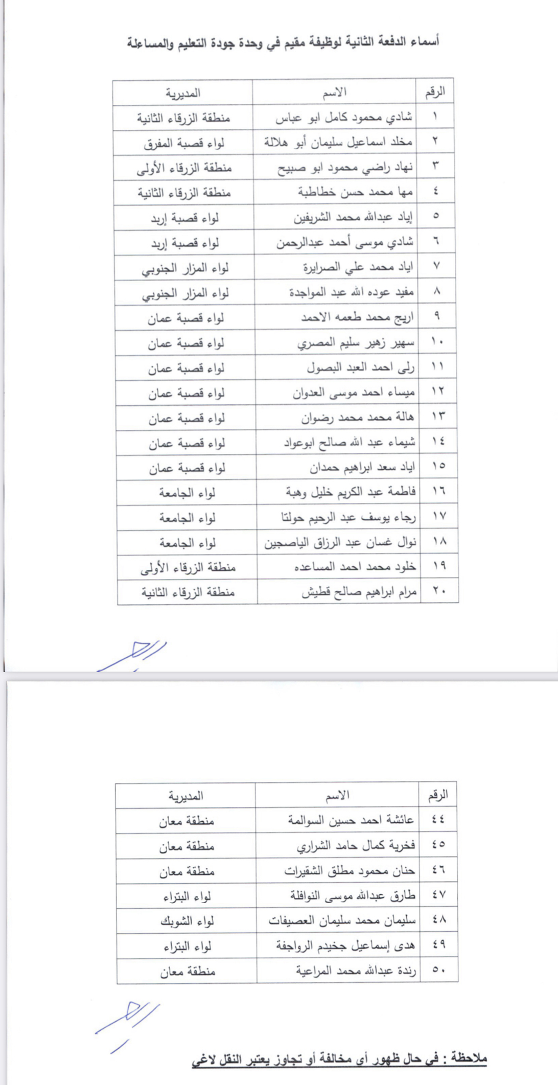 قرر الدكتور وجيه عويس وزير التربية والتعليم والتعليم العالي والبحث العلمي وبناءا على تنسيب امينة عام وزارة التربية للشؤون الادارية والمالية الدكتورة نجوى قبيلات نقل التالية اسماءهم من مراكز عملهم بمديريات الميدان برتبهم وراتبهم الى وحدة مراقبة جودة التعليم والمساءلة بمركز الوزارة لمدة عام وتحت التجرية ابتداءا من 1-9-2022