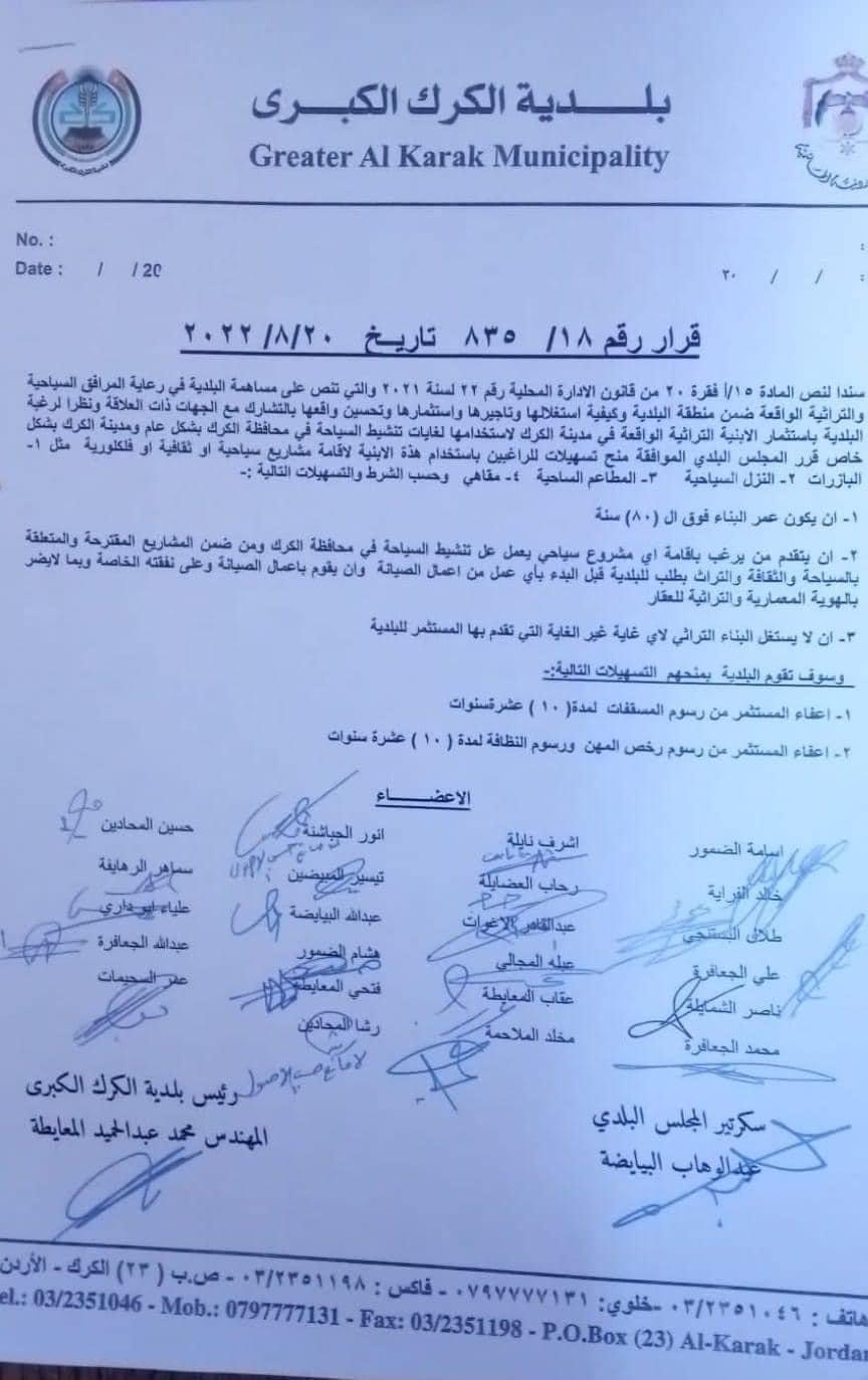 قرر المجلس البلدي منح تسهيلات للراغبين باستخدام الابنية التراثية الموجوده في مدينة الكرك لاقامة مشاريع سياحية و فلكلوريه على أن لا يقل عمر الابنيه عن ٨٠ عام .