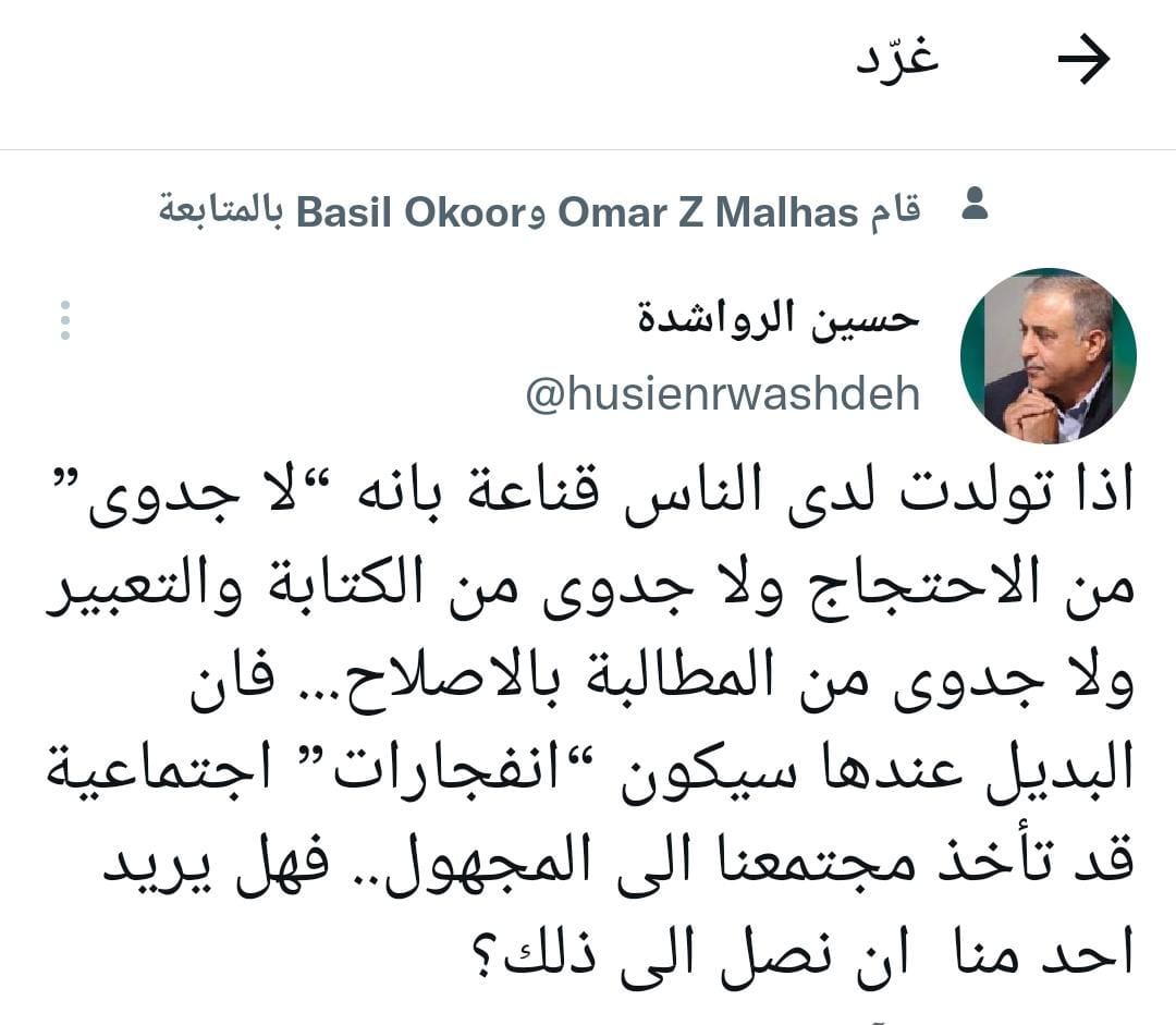 وقال الرواشدة في تغريده عبر توتير، إنه "إذا تولدت لدى الناس قناعة بأنه لا جدوى من الاحتجاج ولا جدوى من الكتابة والتعبير ولا جدوى من المطالبة بالإصلاح... فإن البديل عندها سيكون انفجارات اجتماعية قد تأخذ مجتمعنا إلى المجهول.. فهل يريد أحد منا أن نصل إلى ذلك؟".اخبار الاردن