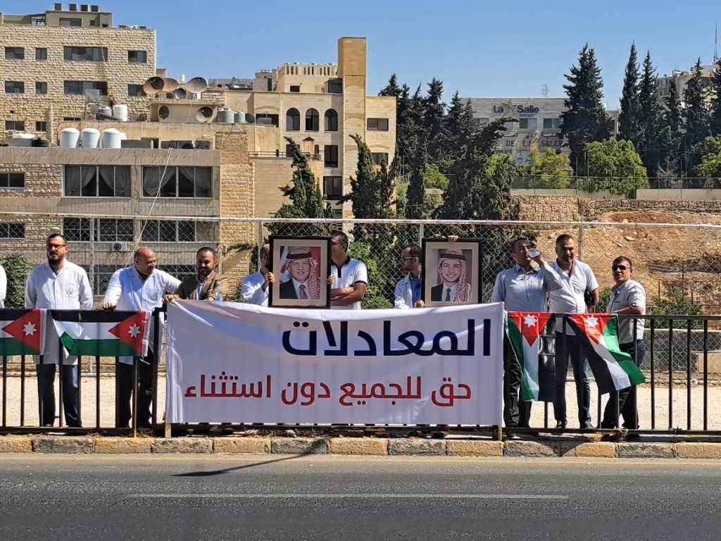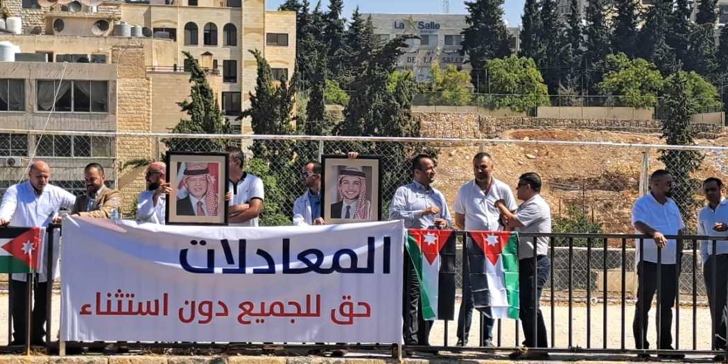 نفذ عدد من الأطباء حملة البورد الأجنبي داخل الأردن العاملين في مستشفيات وزارة الصحة، وقفة بالروب الأبيض أمام مجلس النواب وحملوا صورا للملك عبدالله الثاني بن الحسين، والأعلام الأردنية و يافطة كُتب عليها “المعادلات حق للجميع دون إستثناء”.
