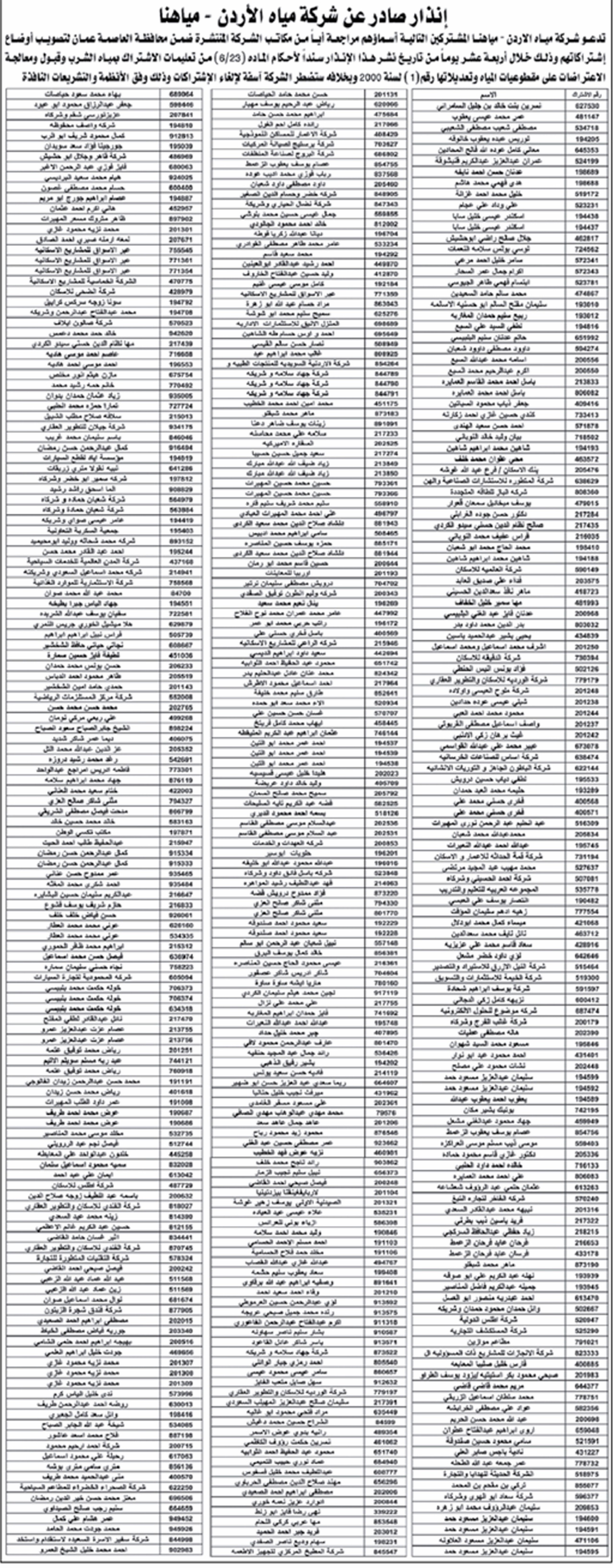 وجاء في إعلان للشركة، "تدعـو شـركة مياه الاردن - مياهنا المشتركين التالية أسماؤهم مراجعة أيـا مـن مكاتب الشركة المنتشرة ضمن محافظة العاصمة عمان لتصويب أوضـاع اشتراكاتهم وذلك خلال أربعة عشر يوماً من تاريخ نشر هذا الإنذار سندا لأحكام المادة (6/23) من تعليمات الاشتراك بمياه الشرب وقبول ومعالجة الاعتراضات على مقطوعيات المياه وتعديلاتها رقم ( 1 ) لسنة 2000 ويخلافه ستضطر الشركة آسفة لإلغاء الاشتراكات وذلك وفق الأنظمة والتشريعات النافذة".