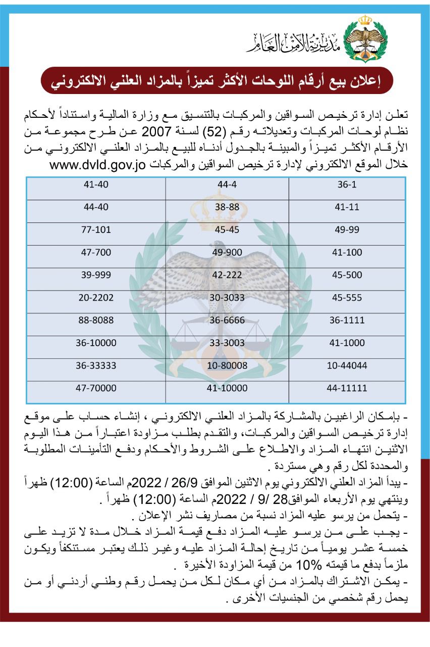 تعلن إدارة ترخيص السواقين والمركبات بالتنسيق مع وزارة المالية واستناداً لأحكام نظام لوحات المركبات وتعديلاته رقم (52) لسنة 2007 عن طرح مجموعة من الأرقام الأكثر تميزاً والمبينة بالجدول أدناه للبيع بالمزاد العلني الالكتروني من خلال الموقع الالكتروني لإدارة ترخيص السواقين والمركبات هنا.