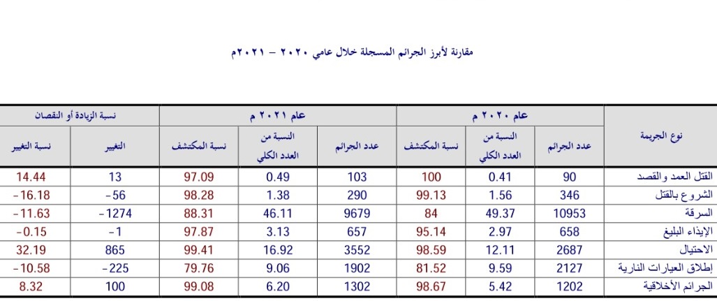 أظهر تقرير الإحصائي الجنائي الصادر عن إدارة المعلومات الجنائية في مديرية الأمن العام، أن هنالك مؤشرات على ارتفاع وانخفاض في نسبة ارتكاب الجرائم خلال عام 2021 مقارنة مع 2020.