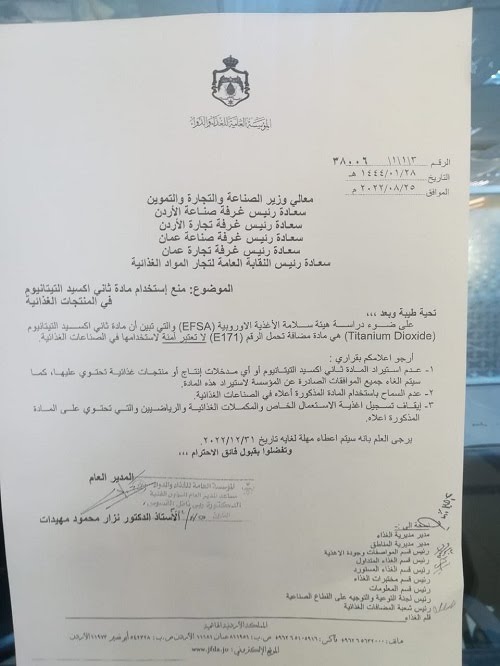 أثار قرار المؤسسة العامة للغذاء والدواء، بحظر استيراد مادة ثاني أكسيد التيتانيوم استحسان الجميع، كيف لا وهي مادة مسرطنة وغير آمنة للاستخدام في صناعة المواد الغذائية، إلا أن المفاجأة الصاعقة للأردنيين كانت بموعد تطبيق قرار حظر الاستيراد والاستعمال وهو حتى نهاية العام (31-12-2022)، ما يعني أننا سنستمر باسخدامها في حياتنا اليومية حتى نهاية العام.