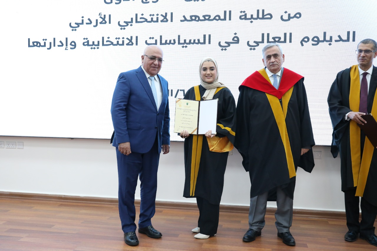 احتفلت الهيئة المستقلة للانتخاب اليوم بتخريج الفوج الأول من طلبة الدبلوم العالي في السياسات الانتخابية وادارتها، من المعهد الانتخابي الأردني، وذلك بحضور رئيس مجلس مفوضي الهيئة المستقلة للانتخاب، المهندس موسى المعايطة ورئيس الجامعة الأردنية الأستاذ الدكتور نذير عبيدات.