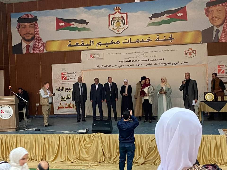 وتضمن الاحتفال عرض فيلم وثائقي عن الراحل الكبير المغفور له الملك الباني، وآخر عن إنجازات المعهد،وفي نهاية الاحتفال، قام مستشار وزير العمل للتدريب السيد عمر قطيشات بتكريم الشركاء وتسليم الشهادات للخريجات، بحضور متصرف اللواء الدكتور بشار الدبوبي وعدد من نواب لواء عين الباشا، ورئيس بلدية عين الباشا جمال الفاعوري، ورئيس لجنة خدمات المخيم الدكتور حسن مرشود، وأعضاء اللامركزية والوجهاء ومدراء المؤسسات الرسمية وممثلي الفعاليات المجتمعية، وأولياء أمور الخريجات.