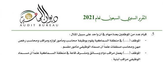 اشار التقرير السنوي لديوان المحاسبة لعام 2021 بأن موظف ببلدية شيحان منطقة السماكية يعمل بوظيفة محاسب ومأمور لوازم ومراقب ومحاسب رخص مهن ومحاسب مسقفات علما ان مسماه الوظيفي مأمور مقسم ، وآخر يعمل مراقب دوام وسائق ومشرف قاعة علما ان مسماه مراقب ابنية