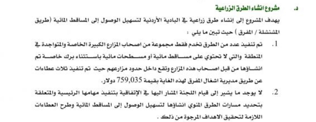 اشار تقرير ديوان المحاسبة السنوي لعام ٢٠٢١ عن قيام مديرية اشغال المفرق بتنفيذ طرق زراعية داخل حدود مزارع خاصة بكلفة وصلت حوالي ٥٠٠ الف دينار .