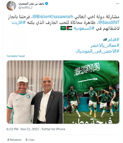 وقال السديري في تغريدة له عبر تويتر، "مشاركة دولة اخي الغالي بشر الخصاونة، فرحتنا بالإنجاز. ظاهرة محاكاة للحب الجارف الذي يكنه الأردن لأشقائهم في السعودية".