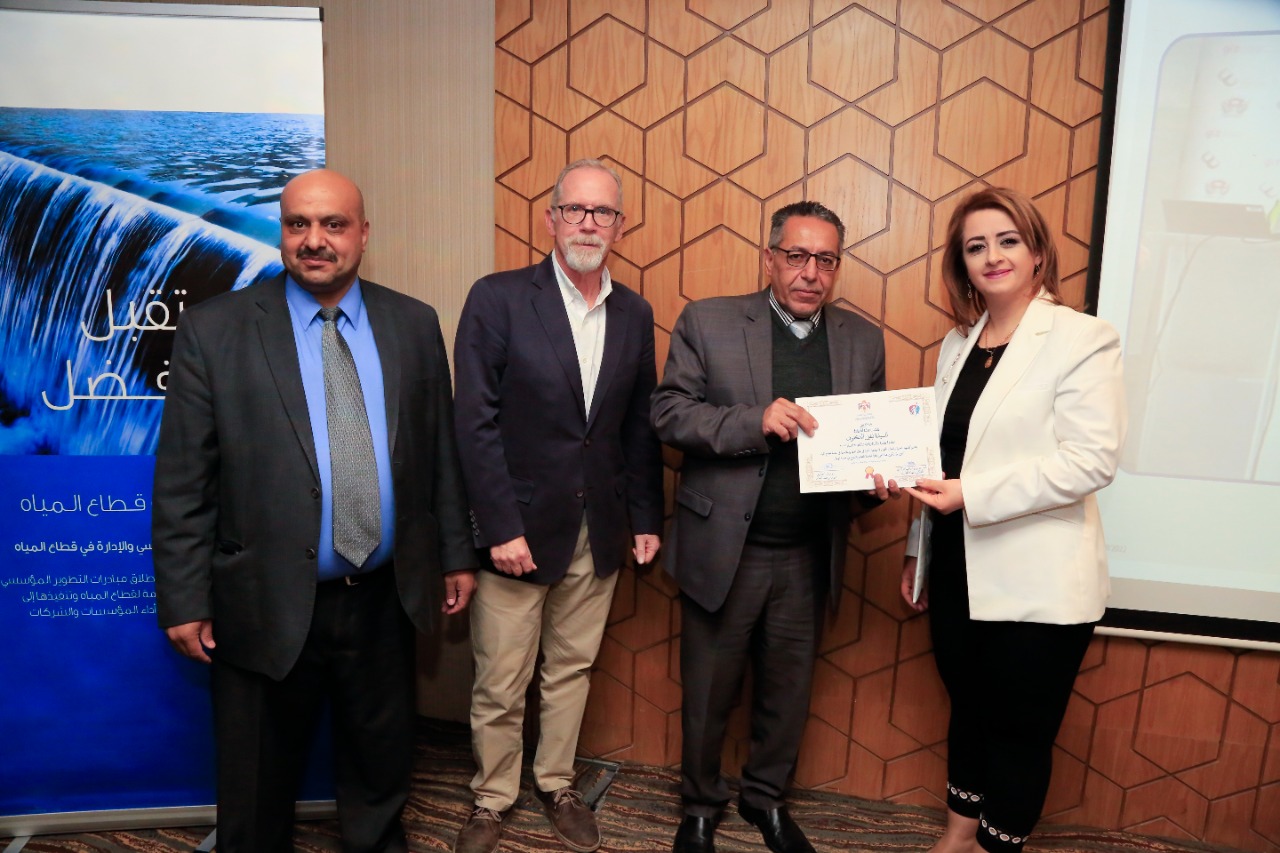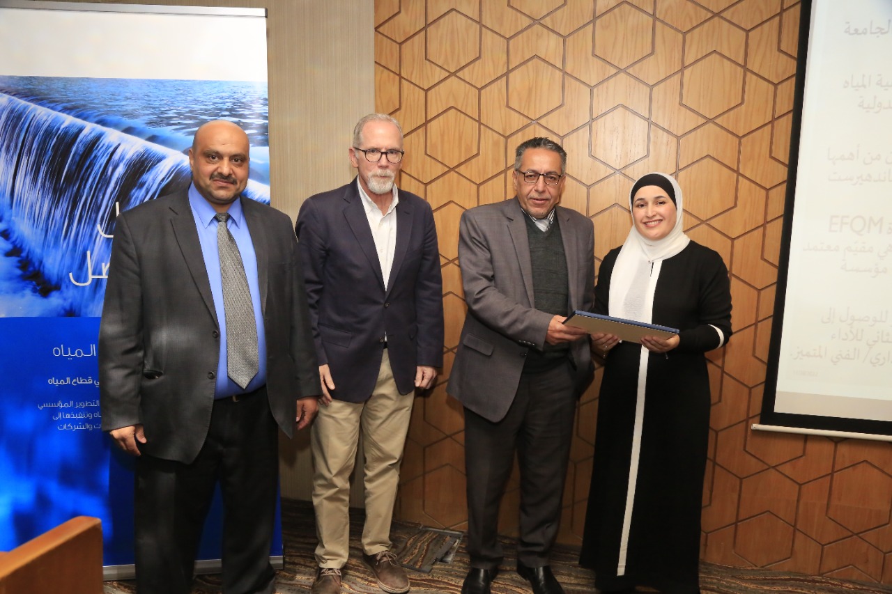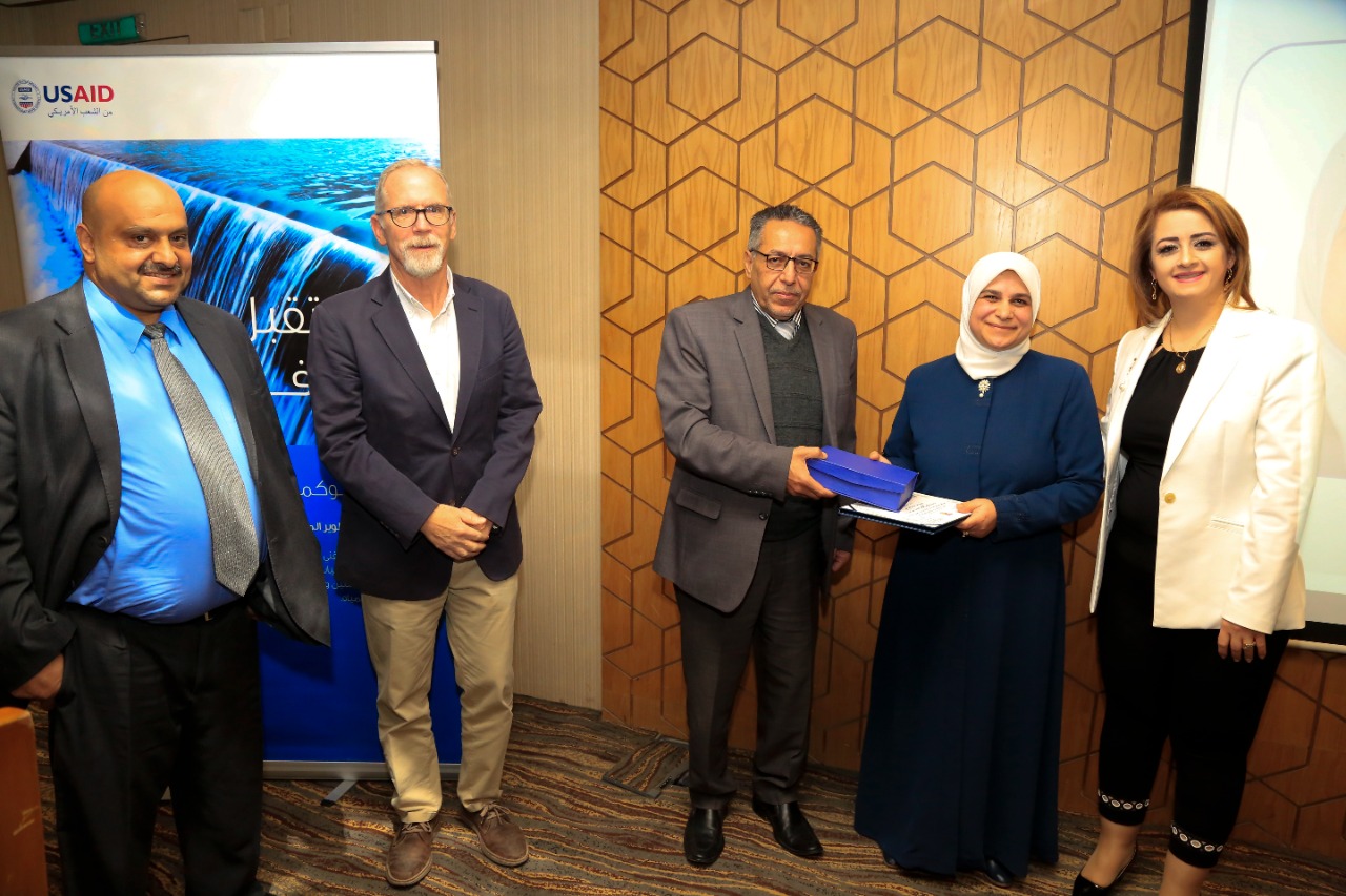 كرم امين عام وزارة المياه والري الدكتور جهاد المحاميد ومدير مشروع حوكمة قطاع المياه USAUD السيد شون مكنالي الفائزات بمبادرة رياديات قطاع المياه بالتعاون مع مشروع حوكمة قطاع المياه، الممول من الوكالة الأميركية للتنمية الدولية بحضور مساعد امين عام الشؤون الادارية والمالية/ الوزارة محمد عفيشات ومساعد امين عام الشؤون الادارية /سلطة المياه عماد القطاونه ومساعد الامين العام لشؤون الاعلام عمر سلامة ومديرة وحدة دراسات المراة نيفين الكفوف وعدد من موظفي وموظفات قطاع المياه .