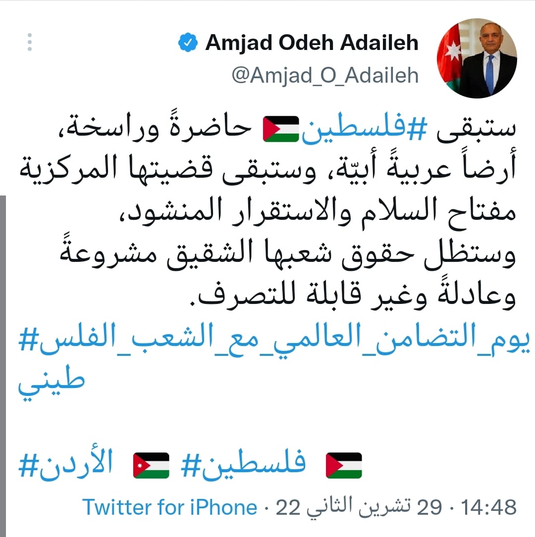 غرّد السفير الأردني في القاهرة أمجد العضايلة، بمناسبة اليوم العالمي للتضامن مع الشعب الفلسطيني، يقول "ستبقى فلسطين حاضرةً وراسخة، أرضاً عربيةً أبيّة، وستبقى قضيتها المركزية مفتاح السلام والاستقرار المنشود".