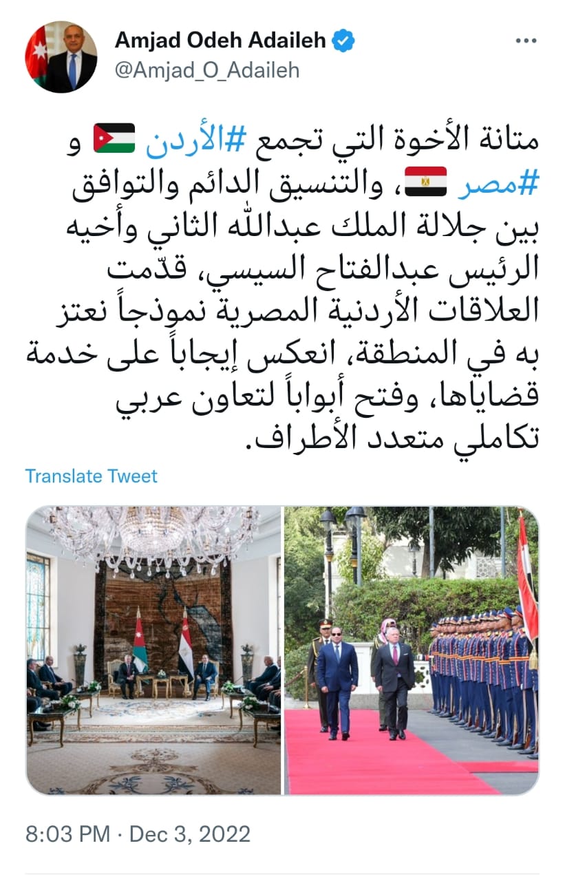 متانة الأخوة التي تجمع #الأردن ?? و #مصر ??، والتنسيق الدائم والتوافق بين جلالة الملك عبدالله الثاني وأخيه الرئيس عبدالفتاح السيسي، قدّمت العلاقات الأردنية المصرية نموذجاً نعتز به في المنطقة، انعكس إيجاباً على خدمة قضاياها، وفتح أبواباً لتعاون عربي تكاملي متعدد الأطراف. https://t.co/3KBamW0ch6