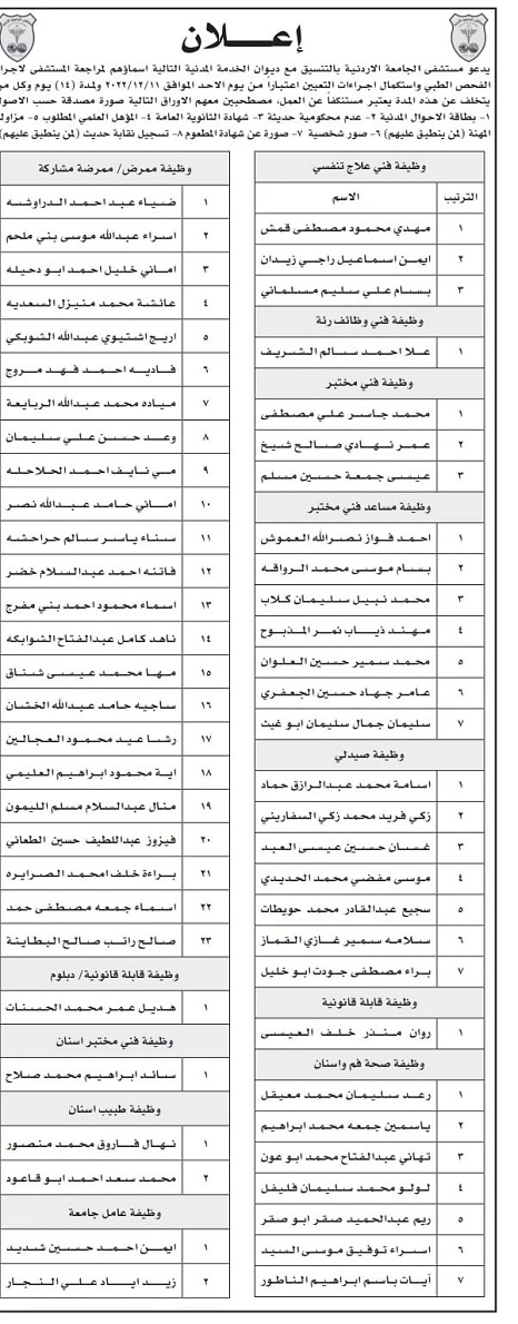 مدعوون لاستكمال إجراءات التعيين بمستشفى الجامعة الأردنية - أسماء