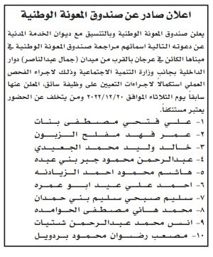 مدعوون للتعيين في صندوق المعونة الوطنية- أسماء