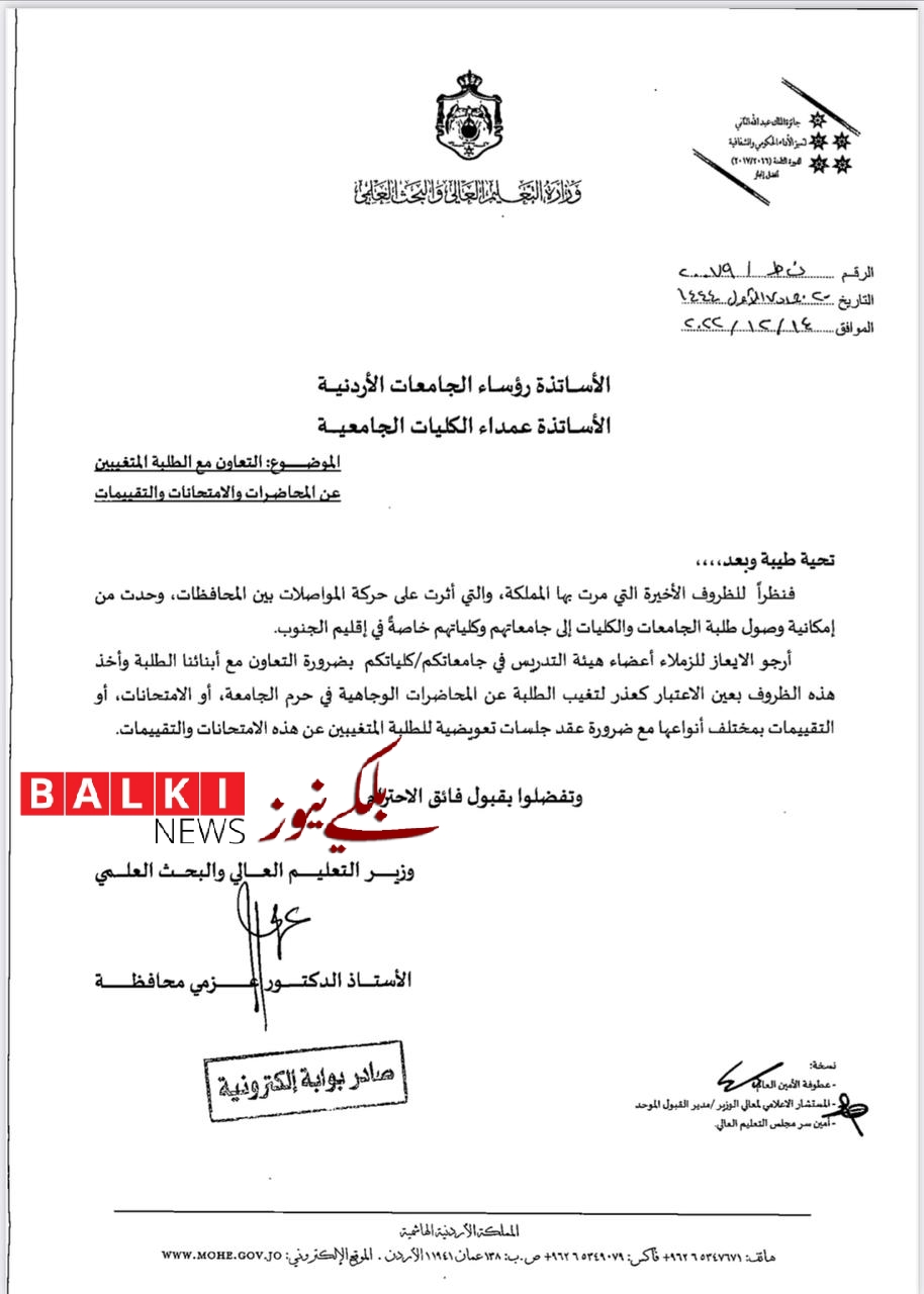 وجه وزير التربية والتعليم والتعليم العالي والبحث العلمي الدكتور عزمي محافظة رؤساء الجامعات وعمداء الكليات الجامعية الى التعاون مع الطلبة بما يتعلق بالحضور والغياب بسبب حالة الاضطراب التي ترافقت مع اعتصام سائقي النقل العمومي للمطالبة بتخفيض المحروقات بحسب الوثيقة التي حصلت عليها بلكي نيوز