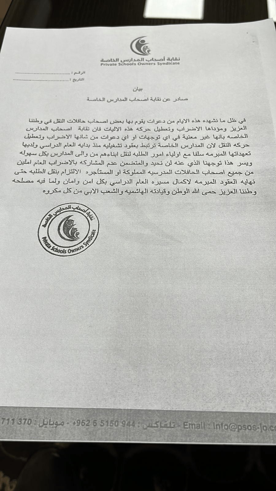 في ظل ما تشهده هذه الأيام من دعوات يقوم بها بعض أصحاب حافلات النقل في وطننا العزيز ومفادها الإضراب وتعطيل حركة هذه الآليات , فإننا نؤكد كنقابة أصحاب مدارس خاصة بأننا غير معنيين في أي توجيهات او دعوات من شأنها الإضراب وتعطيل الحركة لأن مدارسنا ترتبط بعقود تشغيلية منذ بداية العام الدراسي ولديها تعهداتها المبرمة سلفا مع أولياء امور الطلبة لنقل ابنائهم من وإلى مدارسهم بكل سهولة ويسر , هذا توجهنا الذي عنه لن نحيد والمتضمن عدم المشاركة بالإضراب العام آملين من جميع أصحاب الحافلات المدرسية الألتزام بنقل الطلبة حتى نهاية العقود المبرمة لاكمال مسيرة العام الدراسي بكل أمن وأمان ولما فيه مصلحة وطننا العزيز .