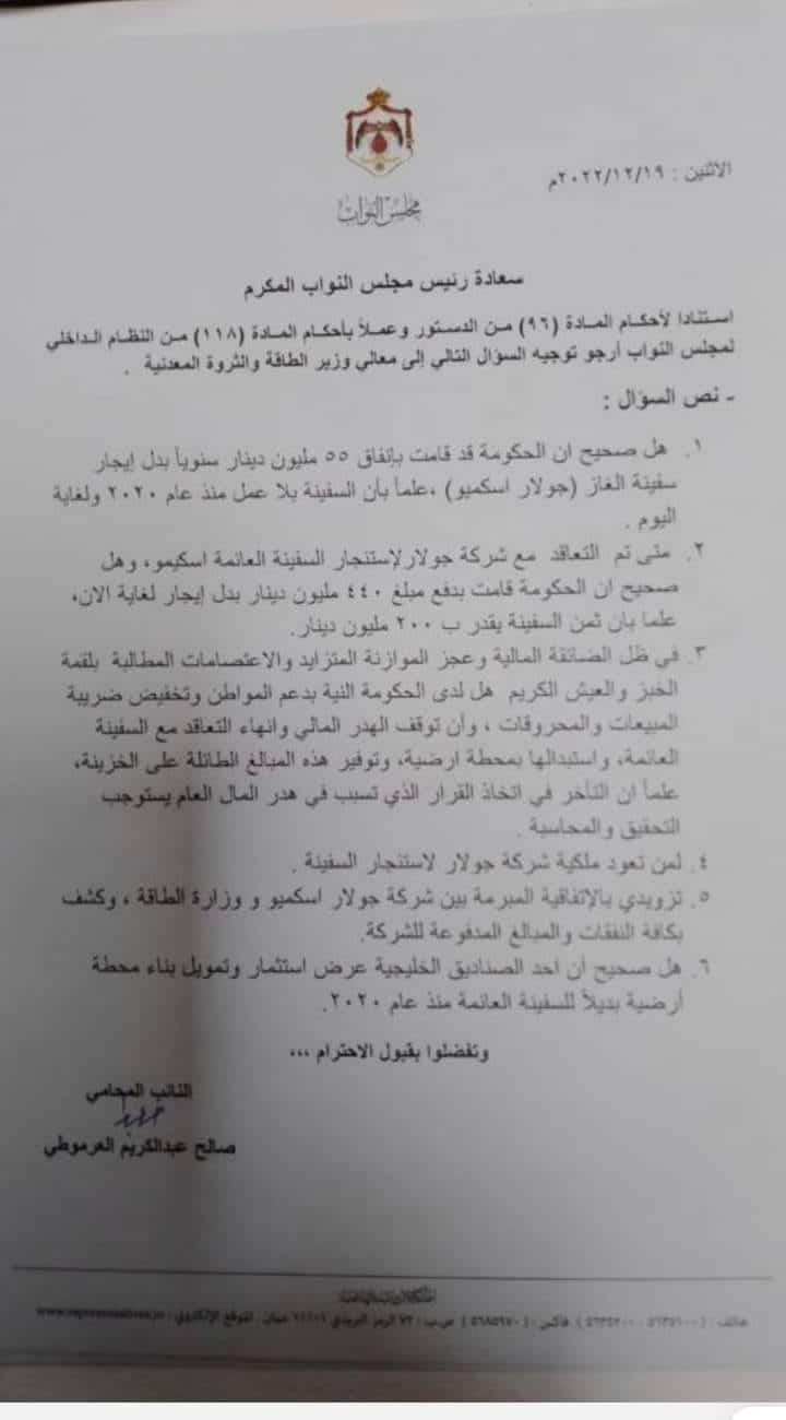 وجه النائب صالح العرموطي سؤالا نيابيًا الى وزير الطاقة والثروة المعدنية صالح الخرابشة حول القيمة المالية التي قامت الحكومة بانفاقها كبدل ايجار سنوي لسفينة الغاز "جولار اسكميو" المتوقفة عن العمل منذ عام 2020 وحتى الآن.