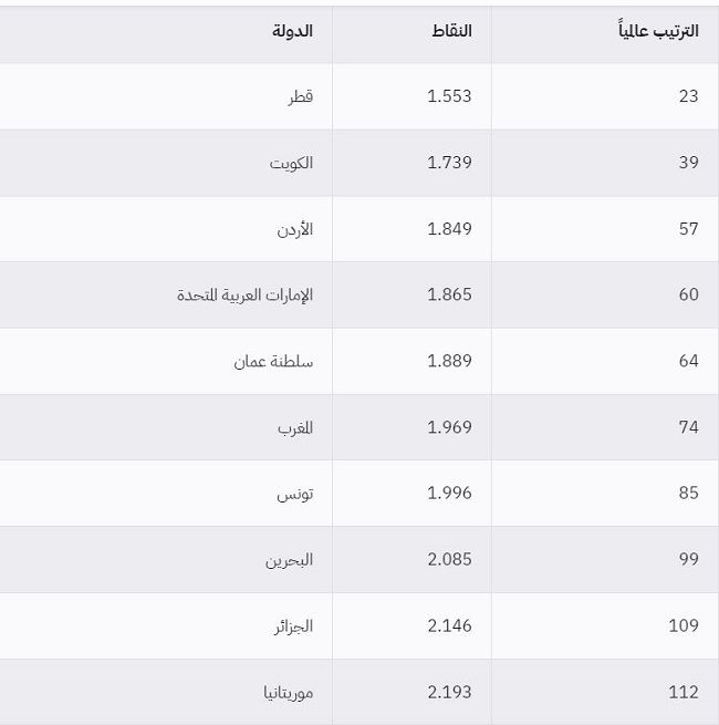 وجاءت الاردن في المرتبة الثالثة عربيا والمرتبة 57 دوليا في مؤشر السلام العالمي. وتتصدر قطر قائمة الدول العربية الأكثر أماناً، وتحتل المركز الـ23 عالمياً، تليها الكويت التي تتأخر عنها عالمياً لتحتل المرتبة الـ39،
