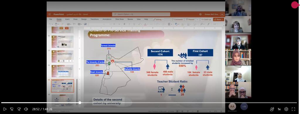 أشارت الدكتورة قبيلات خلال كلمتها إلى تجربة الاردن في تدريب المعلمين قبل وأثناء الخدمة والأثر الإيجابي للتدريب وآليات تنفيذ برامج تدريب المعلمين قبل الخدمة، بالإضافة الى الدبلوم المهني للإعداد تأهيل المعلمين الذي تقوم برعايته الوكالة الأمريكية للتنمية الدولية (USAID) بالشراكة مع وزارة التربية والتعليم ووزارة التعليم العالي والبحث العلمي وأكاديمية الملكة رانيا لتدريب المعلمين وديوان الخدمة المدنية وهيئة اعتماد مؤسسات التعليم العالي وضمان الجودة.