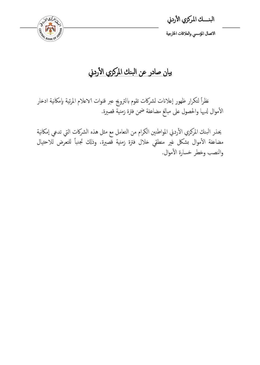 البنك المركزي يحذر الأردنيين