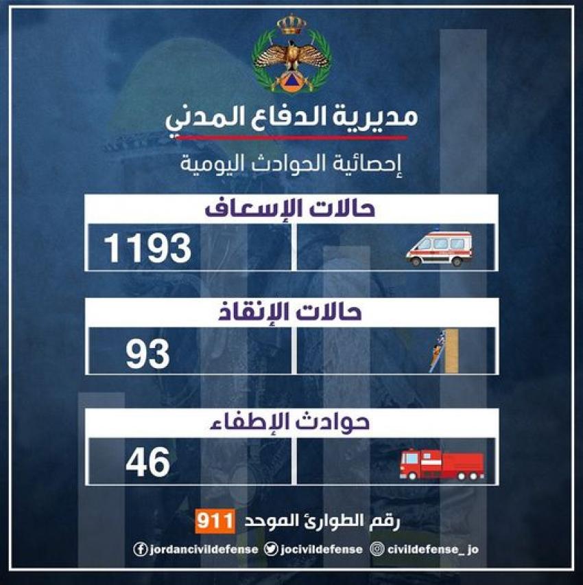 تعاملت مديرية الدفاع المدني خلال الــ 24 ساعة الماضية مع (1193) حالة إسعافية مختلفة حيث تم إجراء اللازم لهم وتأمين وصولهم إلى المستشفيات.