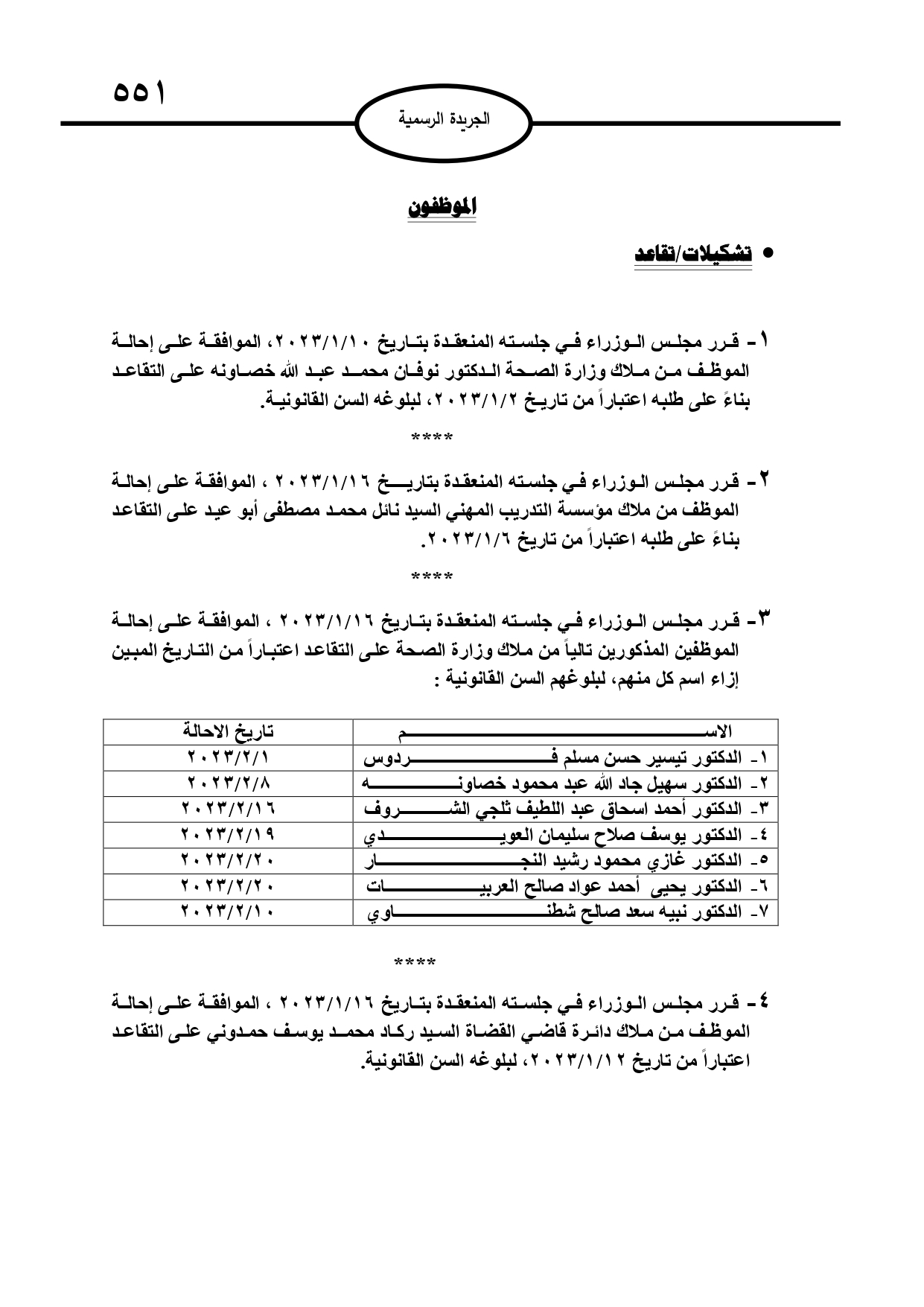 قرر مجلس الوزراء الموافقة على إحالة عدد من موظفي القطاع العام إلى التقاعد.