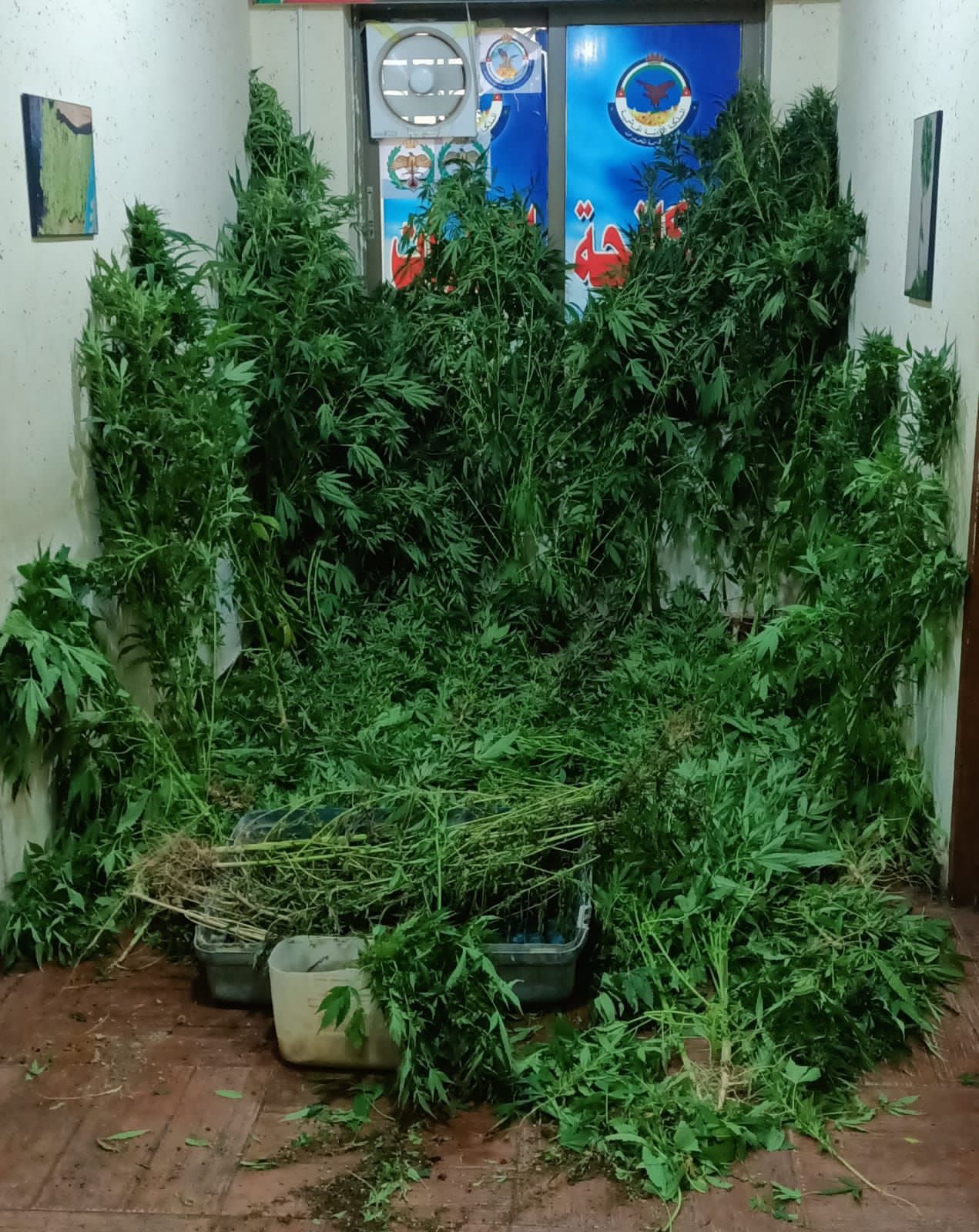 كما وتعاملت الادارة خلال ال 24 ساعة الماضية مع عدد من القضايا النوعية في العاصمة والمفرق وغرب البلقاء ففي احدى القضايا فقد دوهمت خيمة استخدمها احد تجار المخدرات لممارسة نشاطاته الجرمية بزراعة وبيع المخدرات في احدى مناطق غرب البلقاء إذ القي القبض عليه وضبط داخل إحدى الخيام كمية كبيرة من اشتال الماريجوانا التي زرعت داخلها .