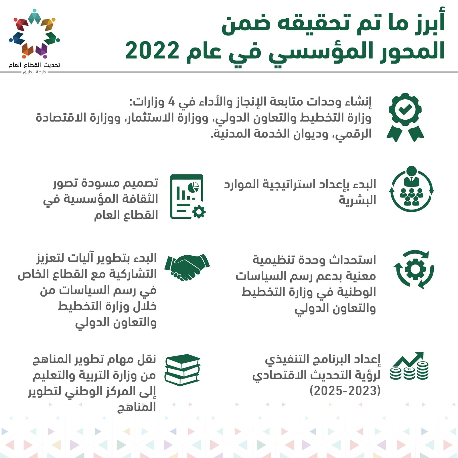 وبحسب الوزير، جرى في هذا المحور، البدء بتطوير آليات لتعزيز التشاركية مع القطاع الخاص في رسم السياسات من خلال وزارة التخطيط والتعاون الدولي، واستحداث وحدة تنظيمية معنية بدعم رسم السياسات الوطنية في وزارة التخطيط والتعاون الدولي، ونقل مهام تطوير المناهج من وزارة التربية والتعليم إلى المركز الوطني لتطوير المناهج، إضافة إلى إعداد البرنامج التنفيذي للرؤية الاقتصادية 2025-2023.