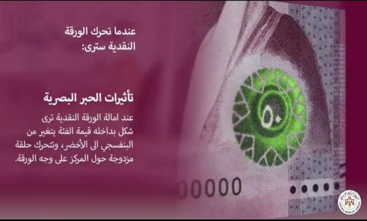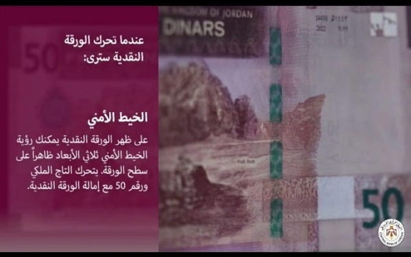 نوه البنك المركزي الأردني، إلى ضرورة التأكيد على كافة المواطنين والمتعاملين بضرورة الانتباه والتأكد من وجود العلامات الأمنية التي تميز أوراق الاصدار الخامس فئة الخمسين دينار.