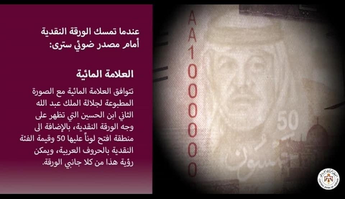 لذلك اقتضى الأمر من البنك المركزي الاردني التنويه وضرورة التأكيد على كافة المواطنين والمتعاملين بضرورة الإنتباه والتأكد من وجود العلامات الأمنية ، والتي سبق وأن قام البنك المركزي بنشرها وتوضيحها عبر وسائل الإعلام المحلية الرسمية وشبكات التواصل الاجتماعي ونشرها كذلك على الموقع الرسمي للبنك المركزي الأردني https://www.cbj.gov.jo/Pages/viewpage.aspx?pageID=1449