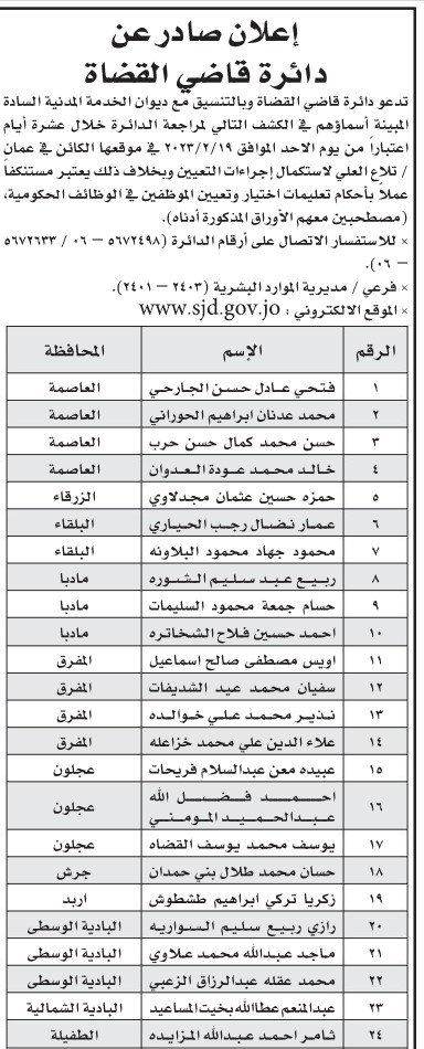 دعا ديوان الخدمة المدنية بالتنسيق مع عدد من الوزارات والمؤسسات الحكومية الأشخاص التالية لإجراء المقابلات الشخصية والامتحان التنافسي .