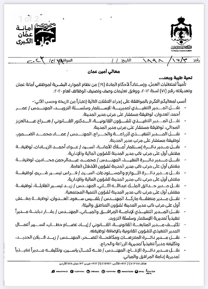 تنقلات إدارية في أمانة عمان الكبرى (أسماء)