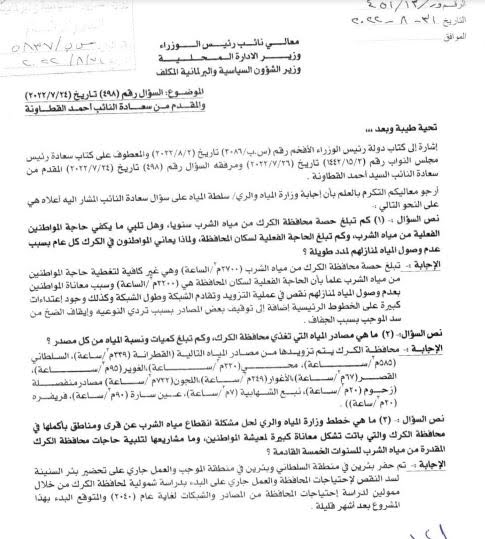 وقال كريشان في معرض رده على سؤال للنائب أحمد القطاونة، واطلعت عليه “هلا أخبار”، إن الحاجة الفعلية لمدينة الكرك من المياه هي 32 الف متر مكعب بالساعة.