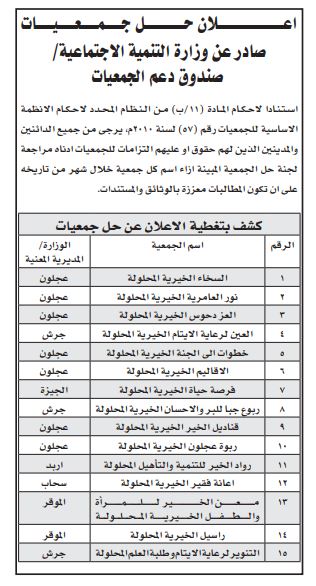 أعلنت وزارة التنمية الاجتماعية اليوم الثلاثاء عن حل 15 جمعية.