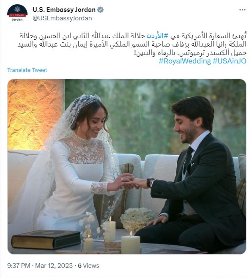هنأت السفارة الامريكية في الأردن جلالة الملك عبدالله الثاني ابن الحسين وجلالة الملكة رانيا العبدالله بزفاف صاحبة السمو الملكي الأميرة إيمان بنت عبدالله والسيد جميل ألكسندر ترميوتس.