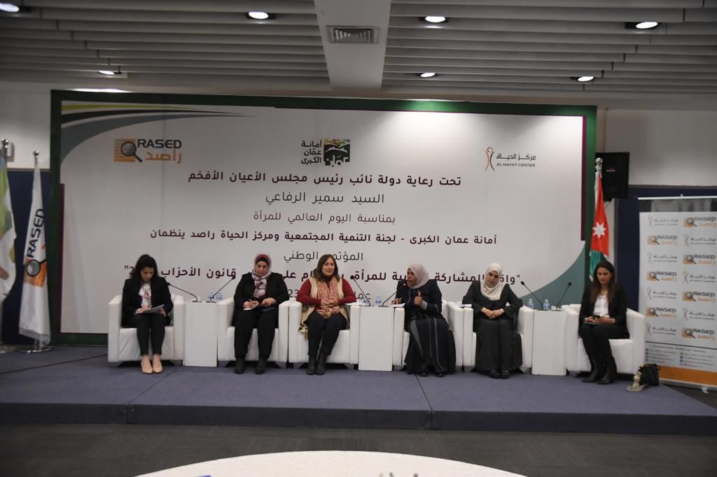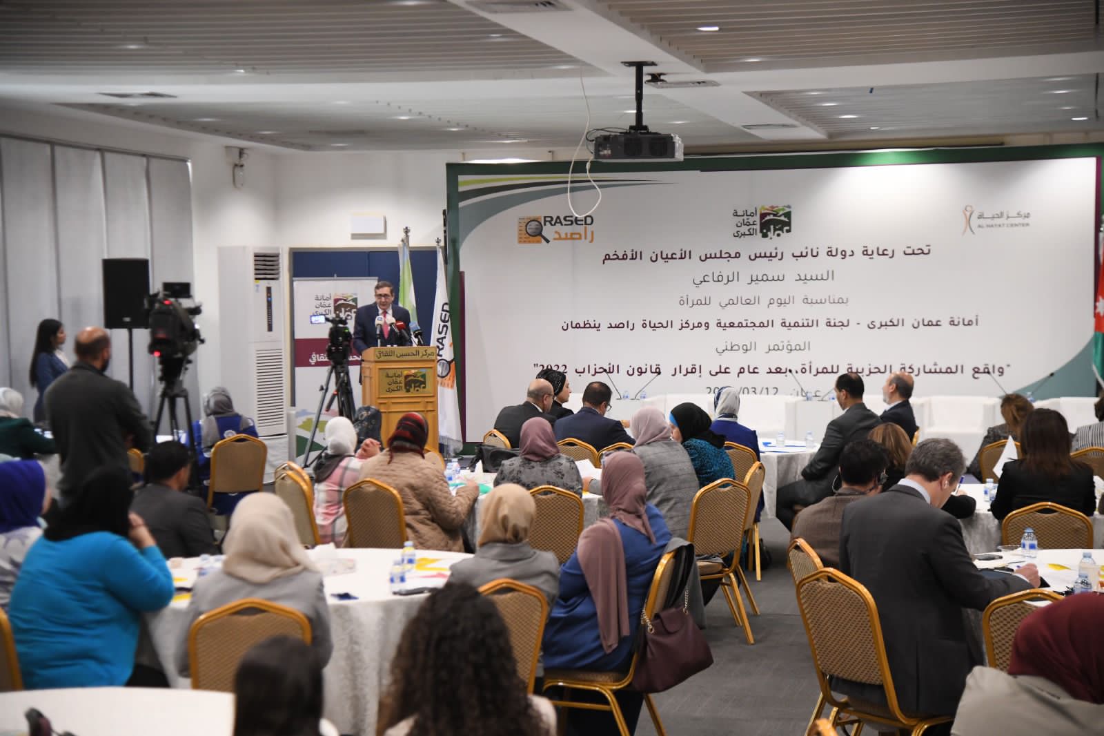 تحت رعاية دولة نائب رئيس مجلس الأعيان سمير الرفاعي نفذ مركز الحياة – راصد بالتعاون مع أمانة عمان الكبرى – اللجنة المجتمعية مؤتمراً وطنياً بمناسبة يوم المرأة العالمي تحت عنوان "واقع المشاركة الحزبية للمرأة، بعد عام على إقرار قانون الأحزاب 2022 من قبل البرلمان الأردني"، وبحضور أمين عام وزارة الشؤون السياسية والبرلمانية الدكتور علي الخوالدة، وحضور عدد من النخب السياسية والحزبية والنسائية والشبابية من مختلف القطاعات والمحافظات، ويأتي هذا المؤتمر انسجامًا مع رؤية الدولة الأردنية في التحديث الشامل، المتمثل في تحديث المنظومات السياسية والاقتصادية والإدارية، ومتوائمًا مع مخرجات اللجنة الملكية لتحديث المنظومة السياسية.