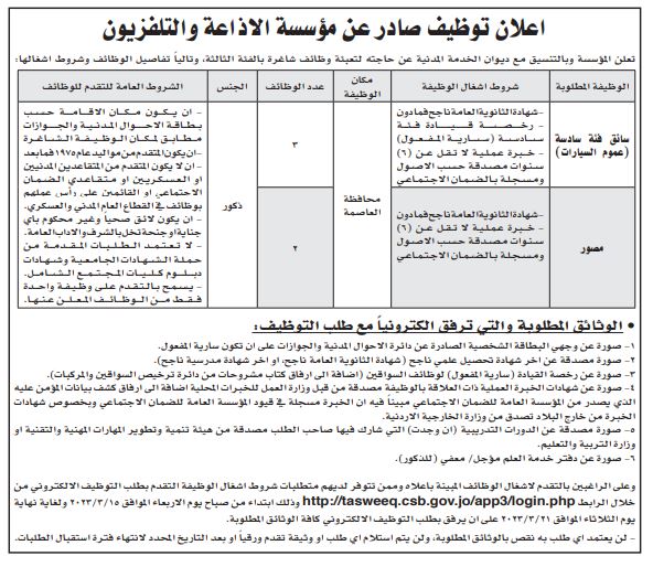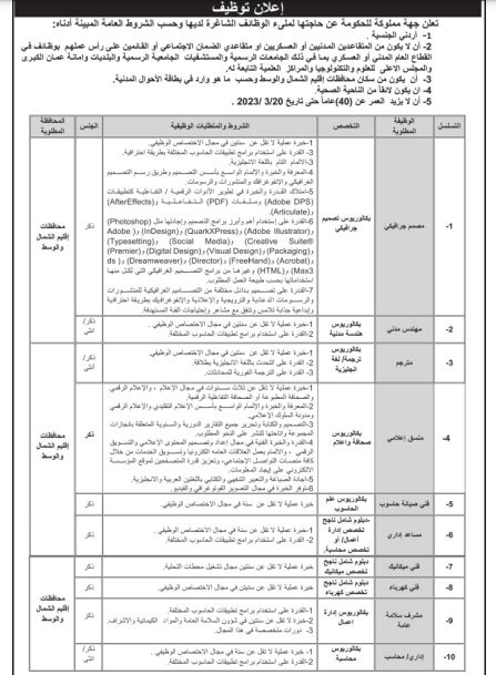 كشفت عدد من المؤسسات والشركات التابعة للحكومة اليوم الأربعاء بالتنسيق مع ديوان الخدمة المدنية عن حاجتها لتعبيئة وظائف شاغرة .