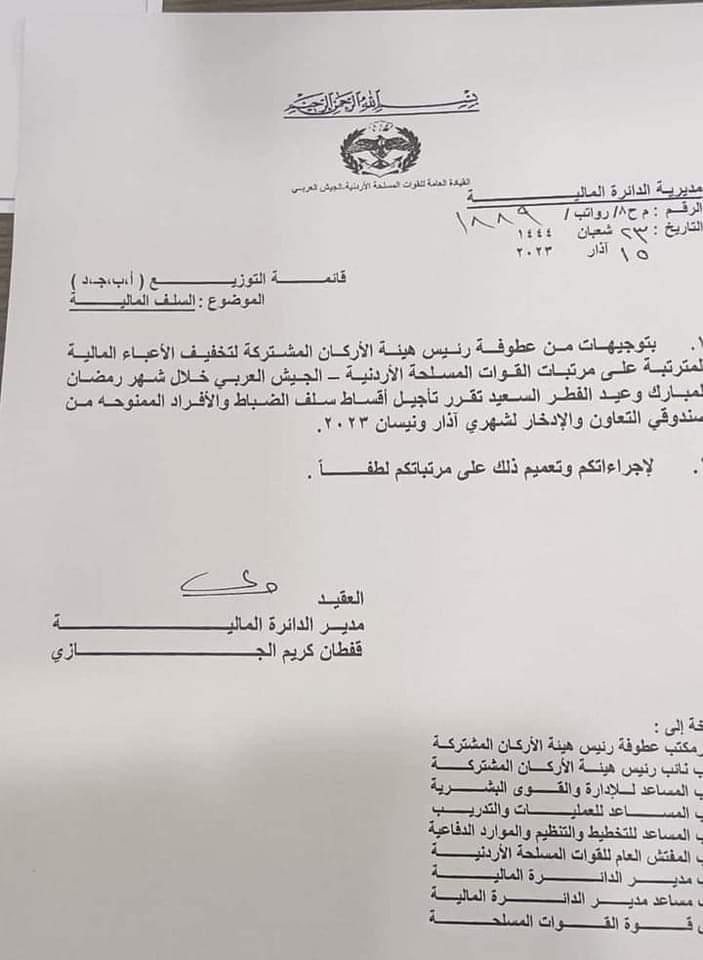 ويأتي هذا القرار بمناسبة قرب حلول شهر رمضان المبارك وعيد الفطر السعيد، وللتخفيف من الأعباء المالية على منتسبي القوات المسلحة الأردنية – الجيش العربي.