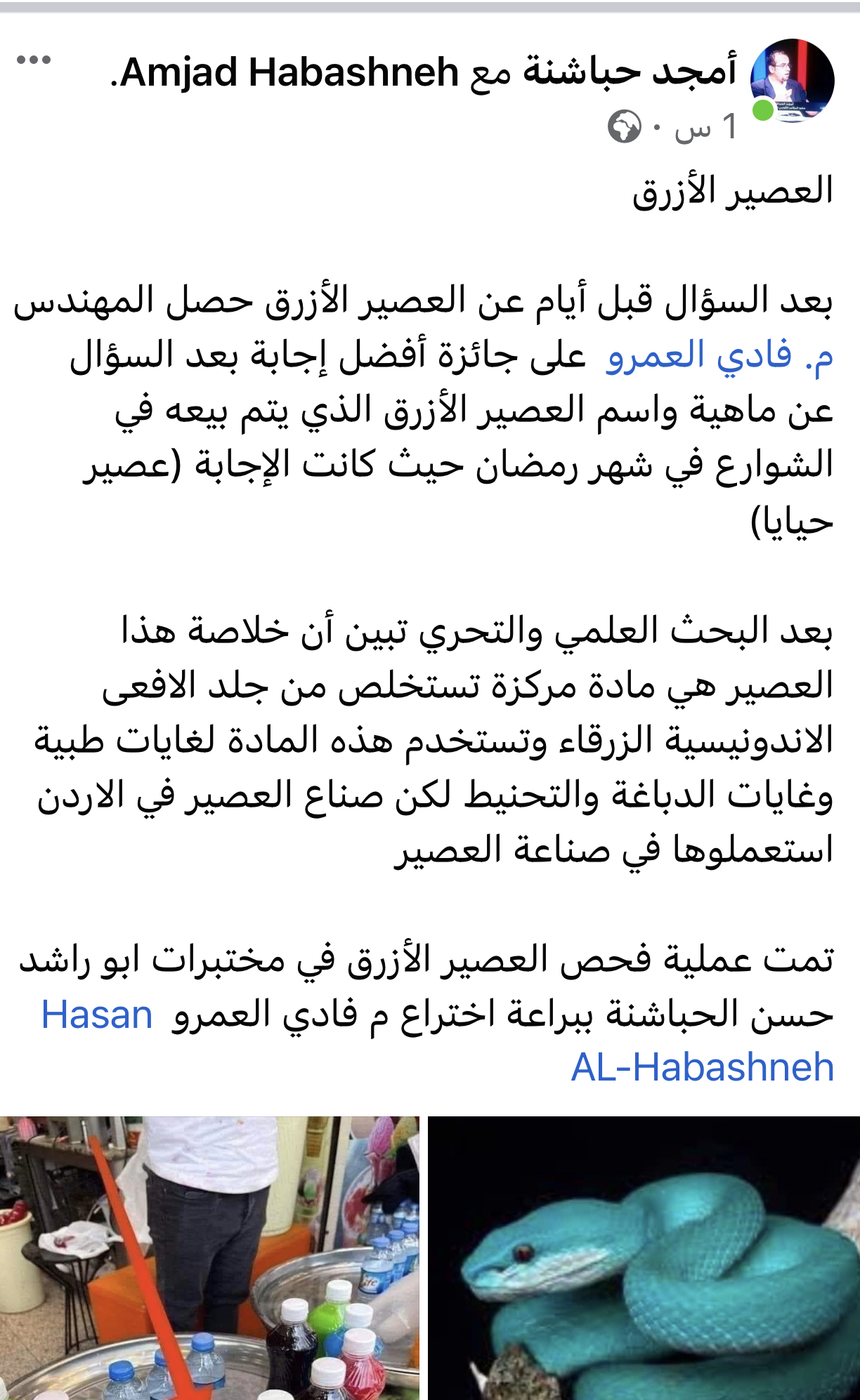 بعد البحث العلمي والتحري تبين أن خلاصة هذا العصير هي مادة مركزة تستخلص من جلد الافعى الاندونيسية الزرقاء وتستخدم هذه المادة لغايات طبية وغايات الدباغة والتحنيط لكن صناع العصير في الاردن استعملوها في صناعة العصير