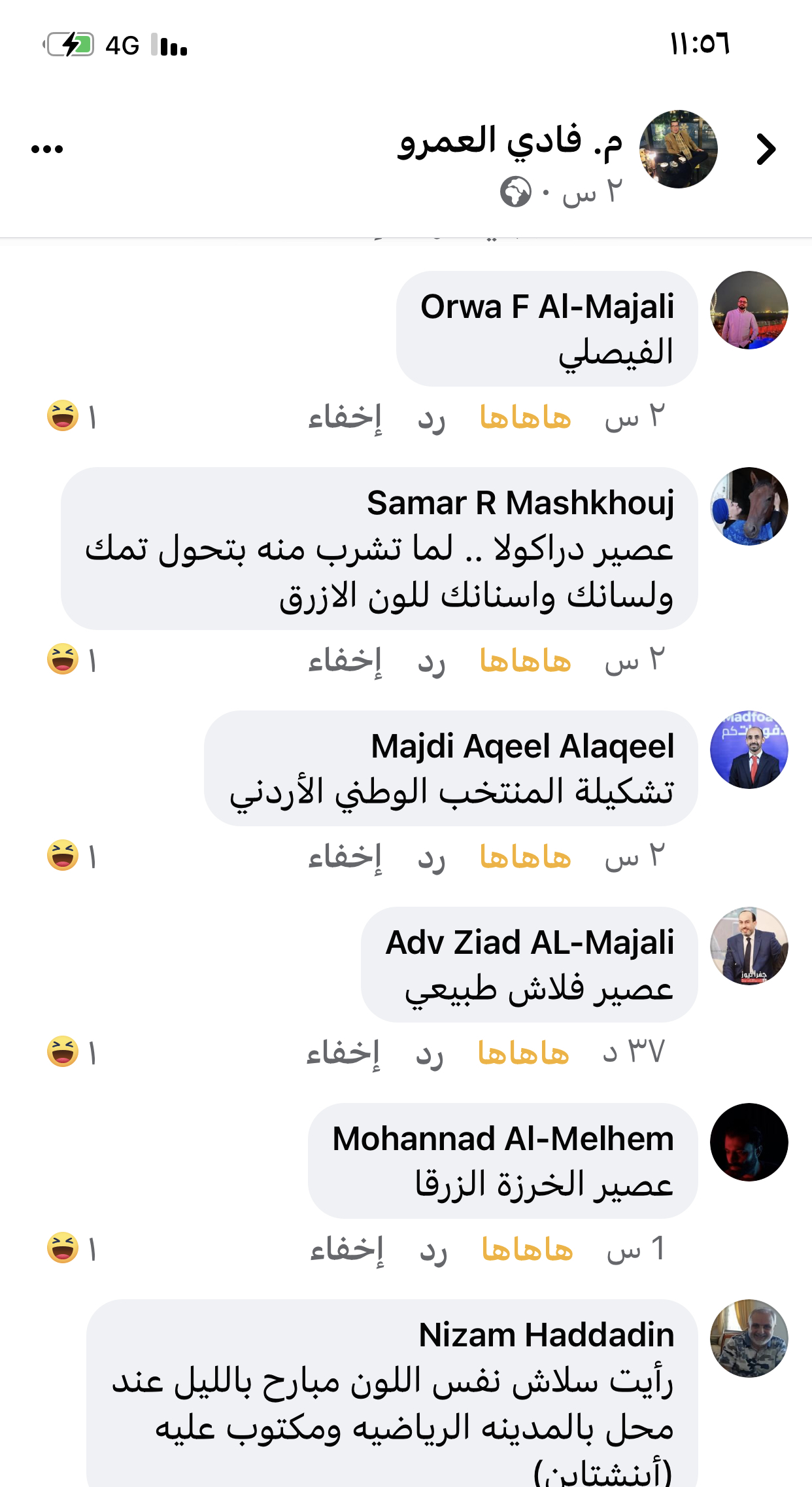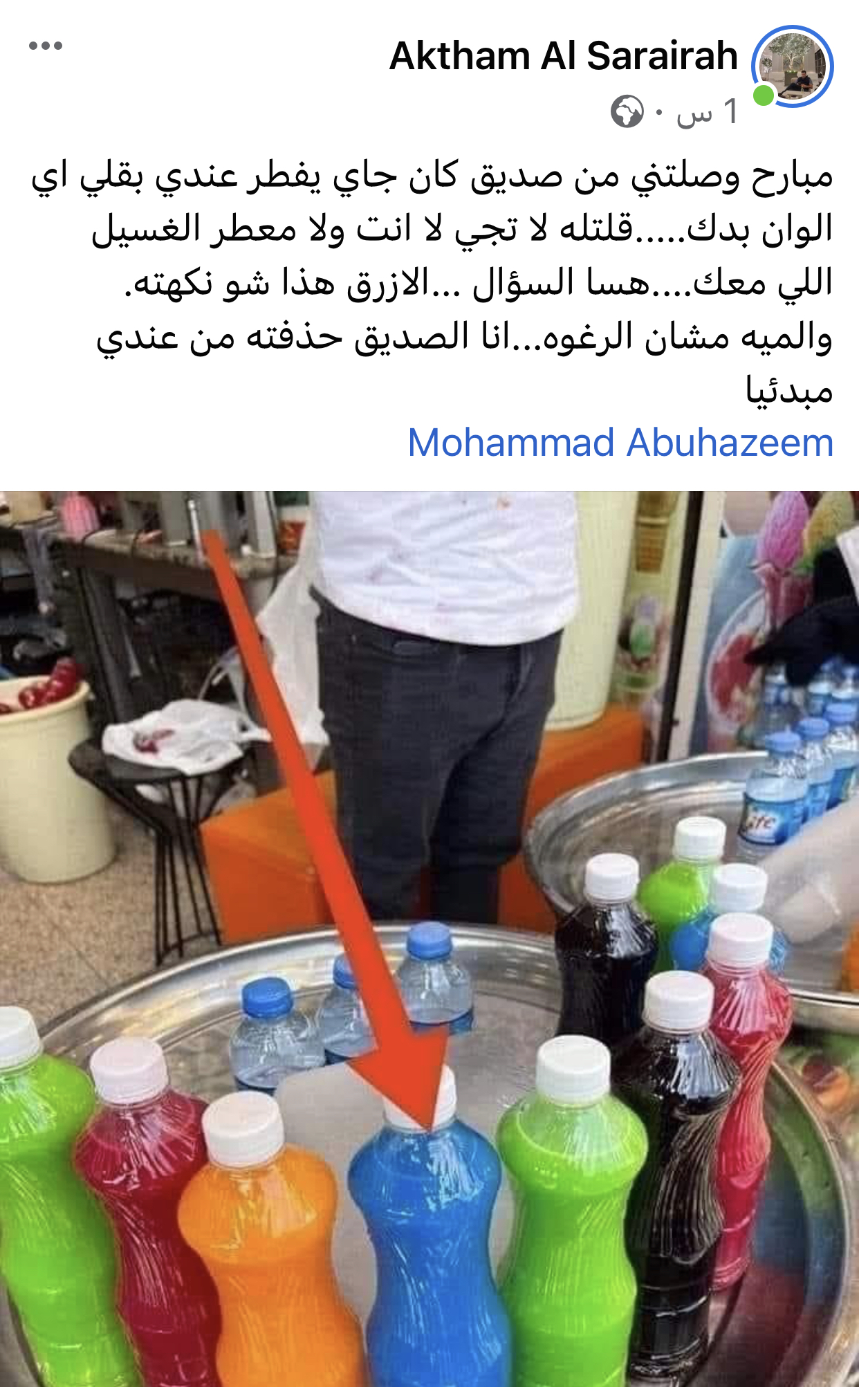 وقال الناشط اكثم الصرايرة ان هذا ليس عصير بل معطر غسيل في تعليق ساخر عبر الفيسبوك جاء فيه :-
