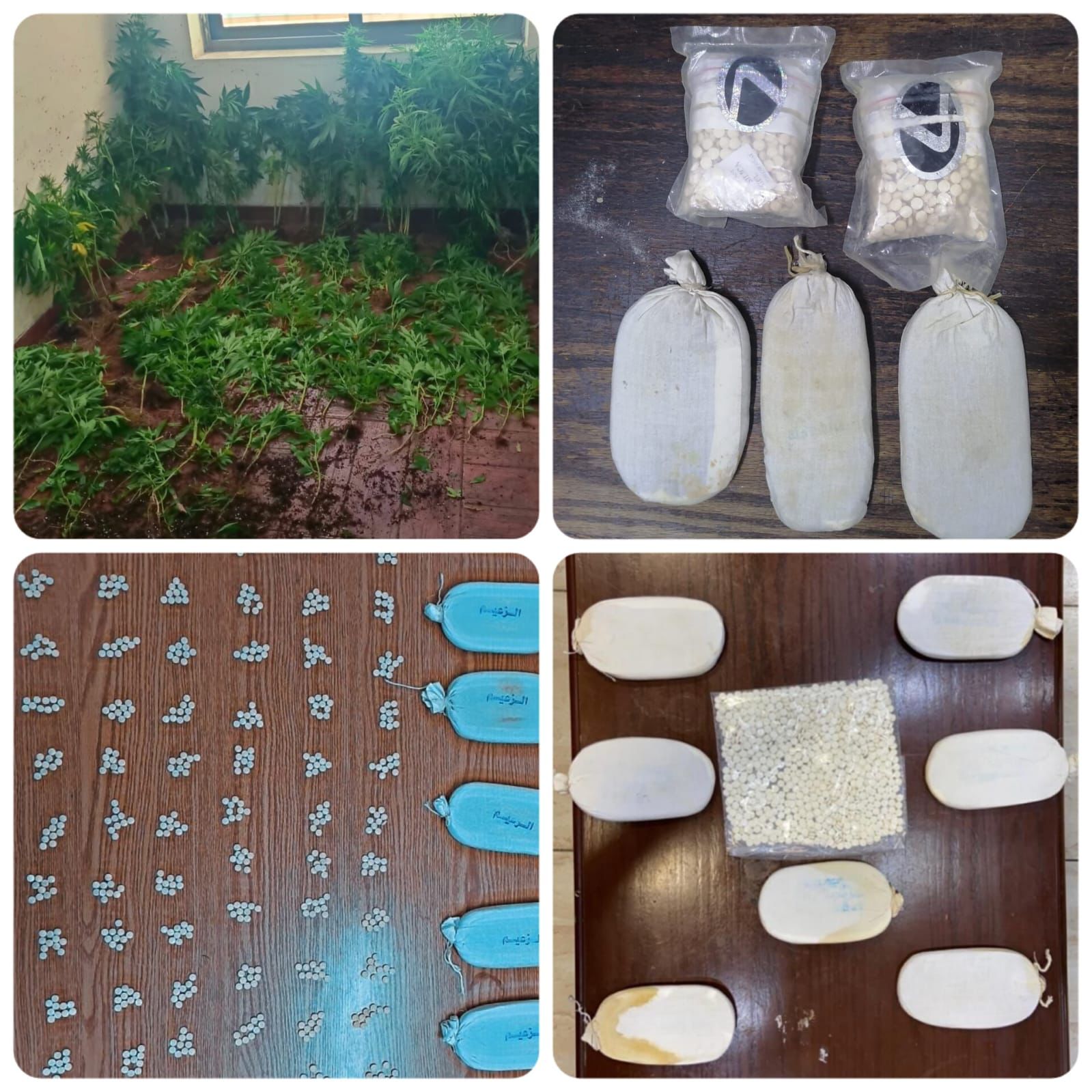 وفي القضية الثالثة ضبط 1 كغم من مادة الكريستال و 3000 حبة مخدرة مع المروج في القضية الثالثة اما في القضية الأخيرة في محافظة المفرق فقد ضبطت 2000 حبة مخدرة و 3 كفوف حشيش مع تاجر للمخدرات، وفي احدى مناطق غرب البلقاء تمت مداهمة احد المنازل التي استخدمها تاجر للمخدرات لزراعة أشتال الماريجوانا وجرى القاء القبض عليه وضبط داخل المنزل 200 شتلة ماريجوانا .