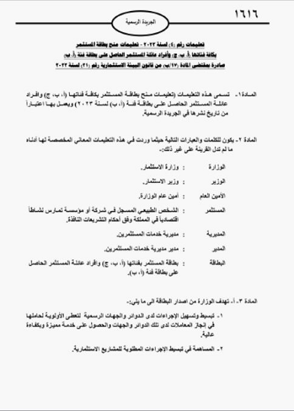 أصدرت الحكومة تعليمات جديدة لمنح بطاقة المستثمر بجميع فئاتها ( أ، ب، ج ) وأفراد عائلة المستثمر الحاصل على بطاقة فئة ( أ، ب ).