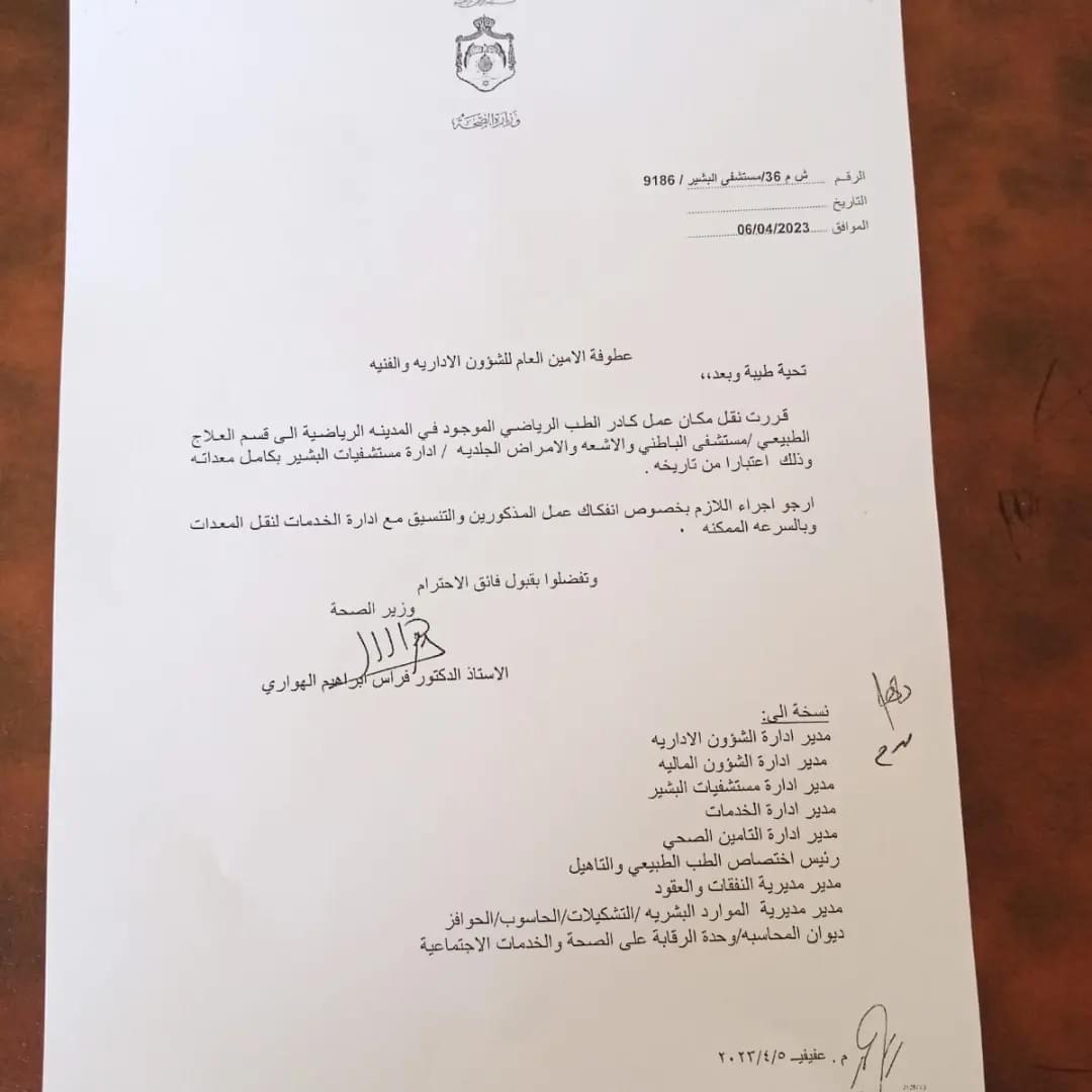 قرار مستهجن من لاعبي ولاعبات مختلف الألعاب الرياضية، من وزير الصحة، الدكتور فراس ابراهيم الهواري، حيث قرر نقل مكان الطب الطبي الرياضي الموجود في المدينه الرياضية إلى قسم العلاج الطبيعي مستشفى الباطني والاشعه والامراض الجنديه، مستشفيات البشير بكامل معداته.