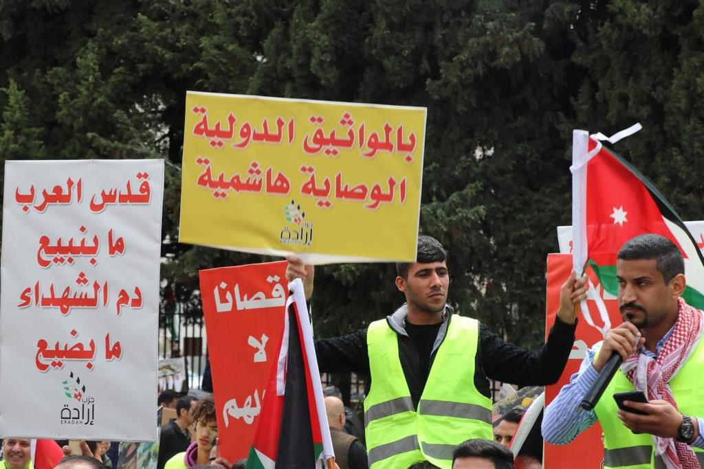 نفذ حزب إرادة الأردني بعد صلاة الجمعة اليوم امام مسجد الجامعة الأردنية وقفة احتجاجية للتنديد بانتهاكات الاحتلال الإسرائيلي في الحرم القدسي الشريف والتأكيد على التمسك بالوصاية الهاشمية على المقدسات بمشاركة شعبية لافتة.